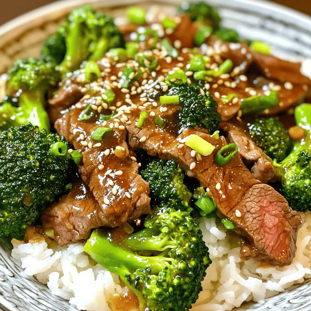 - 1 lb flank steak, thinly sliced against the grain - 3 cups fresh broccoli florets - 2 tablespoons vegetable oil - 3 cloves garlic, finely minced - 1 tablespoon fresh ginger, grated - 1/4 cup low-sodium soy sauce - 2 tablespoons oyster sauce - 2 tablespoons brown sugar - 1 tablespoon cornstarch - 1 teaspoon sesame oil - Cooked white rice or noodles - Sesame seeds for garnish - 2 green onions, finely sliced, for garnish This simple recipe is packed with flavor and is easy to make. You can find flank steak at most grocery stores. It cooks fast and tastes great when sliced against the grain. Broccoli adds a nice crunch. You can use fresh florets for the best taste. For the marinade, you mix soy sauce, oyster sauce, brown sugar, cornstarch, ginger, and sesame oil. This mix gives the beef a rich flavor. The brown sugar adds a hint of sweetness. Cornstarch helps thicken the sauce later. When serving, you can choose rice or noodles. Both options work well with this dish. The sesame seeds and green onions on top make it look nice and add extra flavor. Enjoy making this at home! - In a medium bowl, mix soy sauce, oyster sauce, brown sugar, cornstarch, ginger, and sesame oil. - Add thinly sliced flank steak to the bowl. Coat each piece well in the marinade. - Let the beef sit for 15 minutes. This helps the meat soak up the flavors. - Fill a pot with water and bring it to a rolling boil. - Add the fresh broccoli florets to the boiling water. Blanch for about 2 minutes. - When the broccoli is bright green and slightly tender, drain it in a colander. Set it aside. - In a large skillet, heat 1 tablespoon of vegetable oil over high heat. - Add the marinated beef in a single layer. Cook for 2-3 minutes, stirring occasionally. - Once the beef is browned, remove it from the skillet and set it aside on a plate. - In the same skillet, add the other tablespoon of vegetable oil. - Add minced garlic and sauté for about 30 seconds, stirring to keep it from burning. - Return the cooked beef to the skillet with the garlic. - Add the blanched broccoli to the skillet. Pour in beef broth. - Toss everything together and let it simmer for 3-5 minutes. Stir occasionally until the sauce thickens. - Serve the beef and broccoli over cooked white rice or noodles. - Garnish the dish with sesame seeds and finely sliced green onions. Enjoy the flavors! High heat is key for browning your beef. This step gives your dish great flavor and texture. Start by making sure your skillet or wok is very hot. When the oil shimmers, add your beef in a single layer. This helps it sear well. Don't crowd the pan, or your beef will steam instead of brown. The perfect crunch in broccoli comes from proper blanching. Bring a pot of water to a rolling boil. Add your broccoli florets for about 2 minutes. They should turn bright green and be slightly tender but still crisp. Drain them right away to stop the cooking process. This keeps the broccoli vibrant and crunchy. To elevate the taste of your beef and broccoli, consider adding extra spices. A pinch of red pepper flakes adds heat. You could also drizzle a bit of hoisin sauce for sweetness. Experiment with flavors like sesame seeds or fresh herbs like cilantro. These touches can make your dish truly shine! {{image_4}} You can make this dish even better by adding more veggies. Try using bell peppers. They add color and sweetness. Carrots are also great. Slice them thin for a nice crunch. Snap peas work well, too. They bring a fresh taste and a pop of green. Mixing in these veggies makes your meal healthier and more colorful. If you want to switch things up, try different proteins. Chicken is a good choice. Use thin slices just like the beef. Tofu is a great option for a plant-based meal. It soaks up the flavors well. Shrimp cooks quickly and adds a nice seafood twist. Each protein gives a new taste to this classic dish. For those who need a gluten-free meal, there are easy swaps. Instead of regular soy sauce, use gluten-free soy sauce. It tastes similar and works well in the dish. You can also find gluten-free oyster sauce. These changes keep the flavor while making it safe for everyone to enjoy. To store your beef and broccoli, let it cool first. Place leftovers in an airtight container. This keeps the dish fresh and tasty for up to three days. Store it in the fridge. When ready to eat, just check for any signs of spoilage. You can freeze this dish, too! Let it cool completely, then transfer to a freezer-safe container. Seal it tightly to avoid freezer burn. It can last up to three months. When ready to enjoy, thaw it in the fridge overnight before reheating. To reheat, use a skillet over medium heat. Add a splash of beef broth or water to keep it moist. Stir often until heated through. You can also use the microwave, but do it in short bursts. Cover the dish to hold in moisture. This way, your beef and broccoli stay flavorful and tender. Yes, you can use frozen broccoli. It saves time and is easy to find. Just remember that frozen broccoli may be softer than fresh. To use it, skip the blanching step. Instead, add the frozen broccoli directly to the pan when you combine everything. It will cook through in the sauce. You have many options! You can use sirloin, ribeye, or even ground beef. If you want a lighter protein, try chicken or tofu. Each option will change the taste a bit, but they will still be delicious. Just adjust cooking times based on what you choose. Leftovers can last in the fridge for about 3 to 4 days. Make sure to store them in an airtight container. If you want to keep them longer, you can freeze the dish. It will stay good in the freezer for about 2 to 3 months. When reheating, use low heat to keep the meat tender. This recipe showcases a simple way to make a delicious dish with flank steak and fresh broccoli. You can prepare it with easy steps, ensuring tasty results. Remember, marinating the beef adds flavor, and blanching the broccoli keeps it crisp. Whether you stick to th