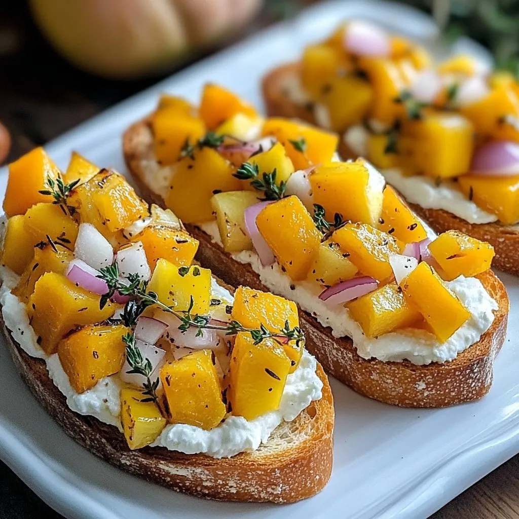 A delightful blend of roasted butternut squash and apple on toasted baguette slices, topped with creamy cheese and fresh herbs.