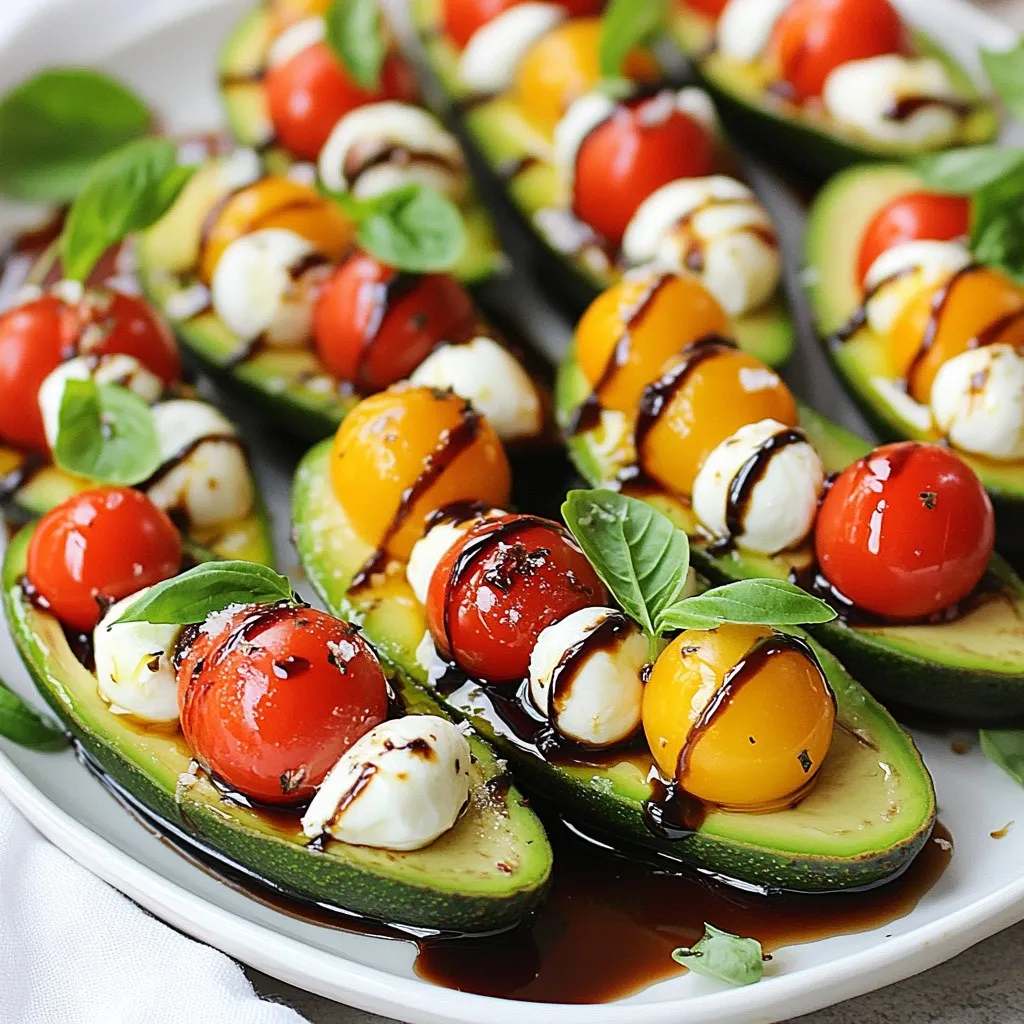 - 2 ripe avocados - 1 cup cherry tomatoes, halved - 1 cup fresh mozzarella balls, halved - 1/4 cup fresh basil leaves, finely chopped - 2 tablespoons balsamic glaze - 1 tablespoon extra virgin olive oil - Salt and freshly ground black pepper, to taste To make Caprese stuffed avocados, you need simple, fresh ingredients. Start with ripe avocados. They should feel soft but not mushy. Next, gather juicy cherry tomatoes. Halve them for easy mixing. Fresh mozzarella balls add creaminess. You can find these in the cheese section. Fresh basil leaves bring a bright flavor. Chop them finely for best results. Balsamic glaze adds a sweet touch. You can make your own or buy it at the store. Extra virgin olive oil enhances the flavor. Finally, don’t forget salt and pepper to taste. These ingredients combine for a fresh and tasty treat. Each bite offers a mix of flavors and textures. You will enjoy this light dish, whether for lunch or a snack. {{ingredient_image_2}} - Halving and Pitting Start by taking your ripe avocados. Carefully slice them in half lengthwise. Gently twist the halves apart. Use a spoon to remove the pit. Be cautious not to damage the flesh. - Scooping Out Avocado Flesh With a spoon, scoop out a small amount of avocado flesh from each half. This creates space for your filling. Place the scooped flesh into a separate bowl. This flesh adds creaminess to your dish. - Mixing Cherry Tomatoes, Mozzarella, and Basil In a medium bowl, combine your halved cherry tomatoes, halved mozzarella balls, and finely chopped basil leaves. This mix gives a fresh taste. - Seasoning with Olive Oil and Balsamic Glaze Drizzle two tablespoons of balsamic glaze into the bowl. Add one tablespoon of extra virgin olive oil as well. Season with salt and freshly ground black pepper. Stir gently to coat all the ingredients. - Incorporating Reserved Avocado Flesh Gently fold the reserved avocado flesh into the Caprese mixture. Be careful not to mash the ingredients. You want a nice mix of flavors and textures. - Filling Each Avocado Half Use a spoon to fill each avocado half with the Caprese mixture. Press down slightly to pack it well. This ensures each bite is full of flavor. - Ripe vs. Overripe Choose avocados that feel slightly soft but not mushy. Press gently on the skin. If it gives a little, it’s ripe. If it feels too soft, it’s overripe. Overripe avocados can taste bitter and will not hold their shape when sliced. - Storing Avocados for Optimal Freshness Keep unripe avocados at room temperature until they ripen. Once ripe, store them in the fridge to slow down further ripening. This helps them stay fresh longer, usually up to a week. If you cut an avocado, sprinkle lemon juice on it to prevent browning. - Adjusting Seasoning to Taste Always start with a pinch of salt and pepper. Taste the filling before stuffing the avocados. You can add more salt, pepper, or even herbs like oregano or thyme to enhance the flavor. - Additional Ingredients to Consider Want to mix it up? You can add diced red onion for crunch or sliced olives for a briny kick. For a spicy twist, try adding crushed red pepper flakes. This will give your Caprese stuffed avocados a fresh and unique spin! Pro Tips Choose Ripe Avocados: Ensure your avocados are perfectly ripe for the best flavor and texture. They should yield slightly to gentle pressure when squeezed. Fresh Ingredients Matter: Use the freshest mozzarella and basil possible to enhance the overall taste of the dish. Customize the Filling: Feel free to add other ingredients like diced cucumbers or olives for extra flavor and texture variation. Presentation is Key: For an elegant touch, serve the stuffed avocados on a bed of mixed greens or with a side of crusty bread. {{image_4}} You can switch the cheese in this recipe. Instead of fresh mozzarella, try feta or goat cheese. These cheeses add a sharp, tangy taste. This change can brighten up the dish. You will enjoy the creaminess of the avocado with these flavors. You can also add protein to your stuffed avocados. Grilled chicken or shrimp works great. This adds a nice texture and makes the dish more filling. You can mix the cooked protein into the Caprese filling. It’s a simple way to turn this appetizer into a meal. Try using different herbs to change the flavor. Instead of basil, use parsley or cilantro. Each herb brings a unique taste to the dish. You can even mix herbs for a more complex flavor. Using flavored balsamic glaze is another fun idea. You can find balsamic glazes infused with flavors like garlic or chili. This will add depth to your dish. Don't be afraid to experiment! Each tweak can make your Caprese stuffed avocados even more exciting. - Refrigeration Tips: Store leftover Caprese stuffed avocados in the fridge. This keeps them fresh. Place them in a cool spot, and consume them within two days. The flavors stay bright if stored well. - Container Recommendations: Use an airtight container to avoid browning. Wrap each avocado half in plastic wrap for extra protection. This method helps maintain the taste and texture. - Maintaining Texture and Flavor: Reheat gently if needed. Use a low heat setting in the microwave for a few seconds. This helps keep the avocados creamy and the filling fresh. Avoid overheating, as this can make the dish mushy. Enjoy your Caprese stuffed avocados at room temperature, as they taste best fresh! To make Caprese stuffed avocados vegan, I swap out fresh mozzarella for a plant-based cheese. You can use vegan mozzarella or even cashew cheese. This keeps the creamy texture while making it dairy-free. Add a bit of nutritional yeast for a cheesy flavor boost. Yes, you can prepare the filling in advance. Mix the cherry tomatoes, plant-based cheese, and basil, then store it in the fridge. I recommend stuffing the avocados right before serving. This keeps them fresh and prevents browning. Caprese stuffed avocados pair well with many sides. Here are some ideas: - Recipe for Pairing Suggestions