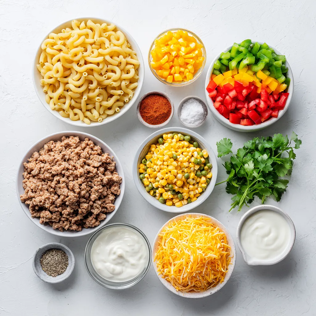 The base of this dish is elbow macaroni. It cooks quickly and holds flavors well. I often use ground turkey for a lighter option, but you can choose beef if you prefer. The taco seasoning adds a robust flavor that ties everything together.