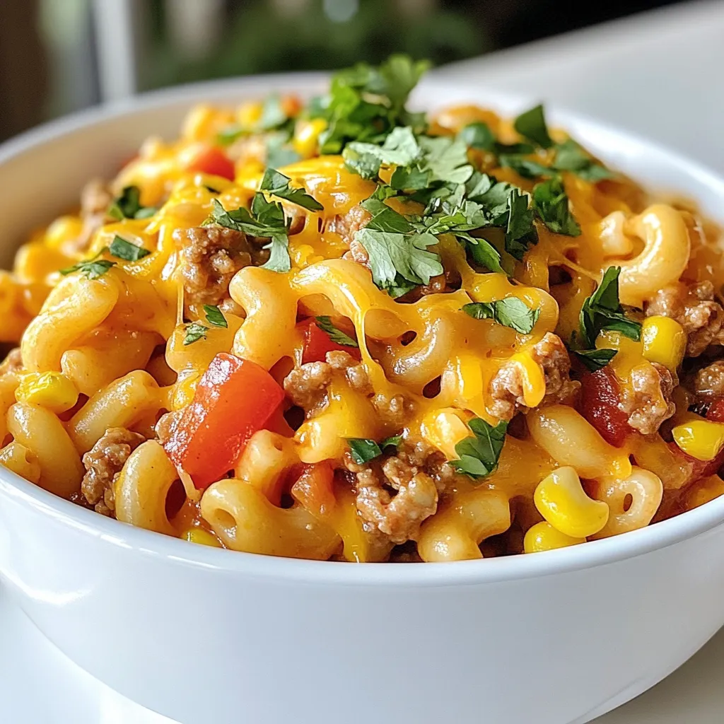 A delicious and creamy pasta dish with a taco twist, featuring ground turkey or beef, bell peppers, and cheddar cheese.