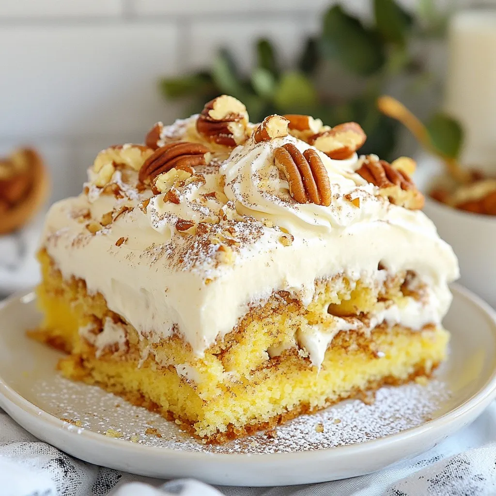 A deliciously moist cake infused with cinnamon rolls and topped with creamy frosting, perfect for dessert lovers.
