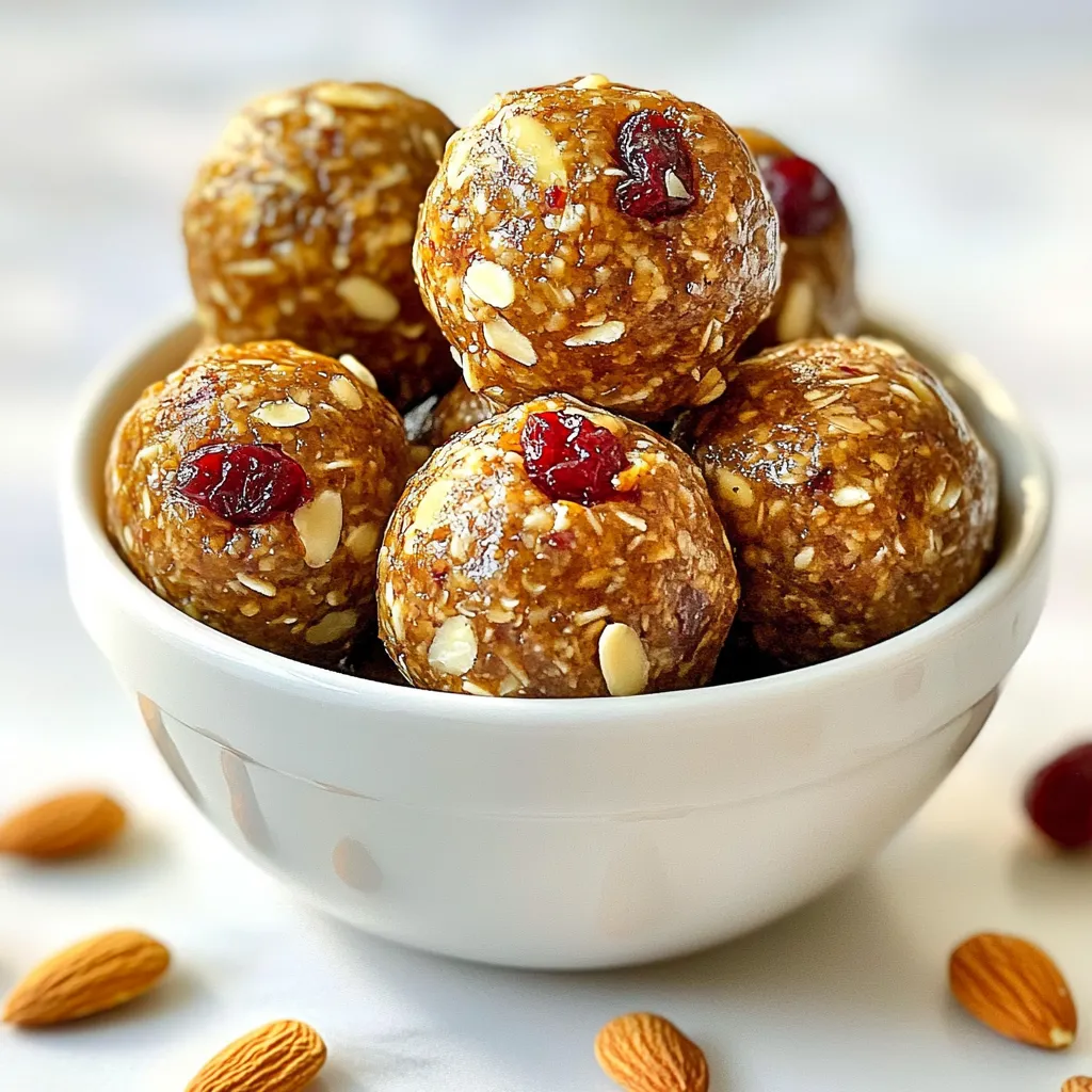 - 1 cup rolled oats - 1/2 cup creamy almond butter - 1/4 cup honey or maple syrup - 1/2 cup dried cranberries, finely chopped - 1/4 cup almond slices - 1/2 teaspoon vanilla extract - 1/4 teaspoon ground cinnamon - Pinch of sea salt The ingredients in these cranberry almond energy balls are simple and wholesome. Each one plays a role in creating a tasty and healthy snack. - Rolled oats provide fiber and help keep you full. - Creamy almond butter adds healthy fats and a rich flavor. - Honey or maple syrup gives natural sweetness. You can choose based on your taste. - Dried cranberries give a burst of tartness and sweetness. - Almond slices add crunch and extra nutrients. - Vanilla extract enhances the flavor. - Ground cinnamon brings warmth and depth. - A pinch of sea salt balances the sweetness. These energy balls are packed with nutrition. They are: - High in fiber: This helps digestion and keeps you feeling satisfied. - Rich in healthy fats: Almond butter and almond slices provide good fats for energy. - Natural sweeteners: Honey or maple syrup gives a sweet taste without refined sugars. Making these energy balls is not just fun; it's smart. You get a snack that is tasty and good for you! {{ingredient_image_2}} - Mixing the base ingredients In a large mixing bowl, combine 1 cup of rolled oats, 1/2 cup of creamy almond butter, and 1/4 cup of honey or maple syrup. Use a spatula or wooden spoon to mix well. You want a thick and sticky blend. - Incorporating additional ingredients Now, add 1/2 cup of finely chopped dried cranberries, 1/4 cup of almond slices, 1/2 teaspoon of vanilla extract, 1/4 teaspoon of ground cinnamon, and a pinch of sea salt. Mix again until everything is evenly combined. - Rolling technique tips With clean hands, grab about a tablespoon of the mixture. Roll it between your palms to create a ball. Keep the balls about the size of a golf ball. Make sure they are smooth and round. - Spacing on the tray Place the balls on a parchment-lined baking sheet. Leave some space between each ball. This helps when you handle them later. - Importance of chilling Put the baking sheet in the fridge and chill for at least 30 minutes. Chilling helps the energy balls firm up. This makes them easier to eat and keeps their shape. - Storing in an airtight container Once firm, transfer the energy balls to an airtight container. They can last in the fridge for up to one week. You can also freeze them for longer storage. Enjoy! To get the best texture for your energy balls, mix your ingredients well. I like to use a spatula to blend the oats and almond butter first. This helps create a sticky base. Next, add the cranberries and almonds, mixing until every piece is coated. If your mixture feels too dry, add a bit more almond butter or honey. Customization is key to making these energy balls your own. You can swap dried cranberries for other dried fruits like apricots or raisins. You can also change almond slices to walnuts or pecans. Adding a scoop of protein powder can give them an extra boost. When serving your energy balls, think about how to make them look great. I like to arrange them in a small bowl. You can sprinkle extra almond slices around for a nice touch. This makes them look inviting and fun to eat. Pair these bites with a cold glass of almond milk or a warm cup of tea. They make a perfect snack for any time of the day. You can even pack them for a picnic or road trip. They are easy to grab and tasty on the go! Pro Tips Use Fresh Ingredients: Always opt for fresh, high-quality dried cranberries and almonds to enhance the flavor and nutritional value of your energy bites. Customize Sweetness: Adjust the sweetness according to your preference by varying the amount of honey or maple syrup. You can also experiment with different sweeteners like agave or coconut nectar. Chill for Firmness: Don’t skip the chilling step! Allowing the energy bites to firm up in the refrigerator helps them hold their shape better, making them easier to handle. Experiment with Add-ins: Feel free to get creative by adding other mix-ins like chia seeds, flaxseeds, or even chocolate chips for a different flavor profile. {{image_4}} You can make your energy balls even more fun! Adding chocolate chips gives a sweet touch. Choose dark chocolate for a richer flavor. You can also add seeds like chia or flax. These seeds boost nutrition and add crunch. If you want a change in sweetness, try agave nectar. It has a mild flavor and is easy to mix in. Date paste is another great option. It adds a rich taste and natural sweetness. Want to make these energy balls gluten-free? Just use gluten-free oats. This keeps the same great taste without gluten. For a vegan version, swap honey for maple syrup or agave. This way, everyone can enjoy these tasty bites! You can keep your cranberry almond energy balls in the fridge for up to one week. Store them in an airtight container to keep them fresh. If you notice any unusual smell or mold, it's time to toss them out. Always check for a change in texture. If they feel too dry or hard, they may not be good to eat. To freeze your energy balls, first, arrange them on a baking sheet in a single layer. Place the sheet in the freezer for about two hours until they are firm. Then, transfer the frozen energy balls to a freezer-safe bag or container. This helps prevent them from sticking together. For thawing, simply take out a few balls and let them sit at room temperature for about 10-15 minutes. Enjoy them fresh and tasty! Cranberry almond energy balls last up to one week in the fridge. Store them in an airtight container. They can also freeze for longer storage. When frozen, they keep well for about three months. Yes, you can use different nuts or seeds! Almonds are great, but walnuts, pecans, or sunflower seeds work well too. Just chop them finely. This lets you customize flavors and textures to your liking. Absolutely! These energy balls are perfect for kids. They are fun to eat and p