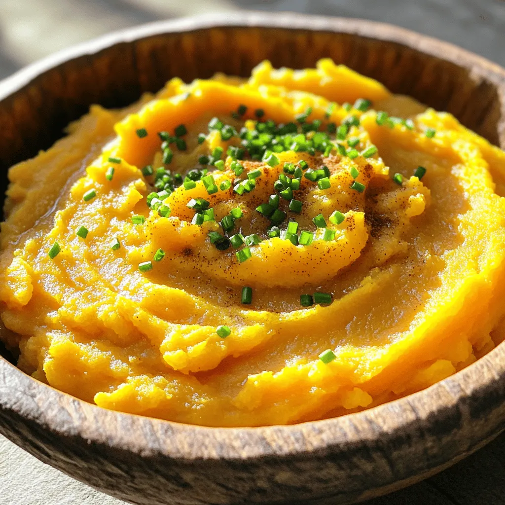- 4 large sweet potatoes - ½ cup unsweetened coconut milk - 3 tablespoons butter - 2 tablespoons pure maple syrup - 1 teaspoon ground cinnamon - ½ teaspoon ground nutmeg - Salt and freshly ground black pepper - 2 tablespoons fresh chives You can easily swap ingredients based on your needs. For a vegan version, use coconut oil instead of butter. If you want a different milk, try almond or oat milk. Both add a nice creaminess. For sweetness, you can use honey or agave syrup instead of maple syrup. This allows you to tailor the recipe to your taste. When making creamy mashed sweet potatoes, these adjustments help create a dish that fits your dietary needs without losing flavor. You can still enjoy a rich and tasty dish. Remember, the key is to maintain the balance of flavors while being creative with your choices. For the full recipe, check out the complete guide above. Start by placing your sweet potatoes in a large pot filled with cold salted water. This step is key. Cold water helps cook the potatoes evenly. If you start with hot water, they can cook unevenly. Bring the water to a boil over medium-high heat. Once it boils, reduce the heat to medium. Let the sweet potatoes simmer uncovered for about 15-20 minutes. They should be soft enough to pierce easily with a fork. After you cook the sweet potatoes, drain them well. Return them to the pot on low heat for a couple of minutes. This lets any extra moisture steam away. Now, add the coconut milk, butter, maple syrup, cinnamon, nutmeg, salt, and pepper. Use a potato masher or an immersion blender to mash the mixture. You want it to be smooth and creamy. If you like it thinner, add more coconut milk slowly until it's just right. Taste your creamy mashed sweet potatoes. Adjust the seasoning with a bit more salt, pepper, or maple syrup if needed. For a lovely presentation, transfer the mash to a serving bowl. Smooth the top with the back of a spoon. Finally, sprinkle fresh chives over the top for a pop of color. Serve warm as a side dish. This dish pairs well with many main courses. For the full recipe, check the earlier section. Coconut milk plays a big role in making these sweet potatoes creamy. It adds rich flavor and smooth texture. Adjust the amount based on how creamy you like it. You can also use almond or oat milk if you prefer. Spices help balance the sweetness of the potatoes. Ground cinnamon and nutmeg bring warmth and depth. Use them wisely to enhance the flavor without overpowering the dish. To save time, peel and cut the sweet potatoes ahead. You can do this a day before cooking. This way, you reduce prep time on the day you want to serve. A potato masher is great for a rustic texture. But if you want it super smooth, use an immersion blender. This tool ensures a silky finish in no time. Creamy mashed sweet potatoes pair well with roasted meats or grilled fish. They also work great as a base for hearty stews. Think of them as a warm hug on your plate. For gatherings, serve them in a large bowl with a sprinkle of chives on top. You can also add a drizzle of olive oil for a touch of elegance. For a fun twist, try mini servings in small bowls or jars. This makes it easy for guests to enjoy! {{image_4}} You can boost the taste of creamy mashed sweet potatoes by adding garlic or herbs. Garlic brings a rich flavor. Fresh herbs like rosemary or thyme add a nice touch. You might also try adding different sweeteners or spices. Honey or brown sugar can give a unique sweetness. A dash of cayenne pepper can add a fun kick! For those on paleo or keto diets, you can make simple swaps. Use ghee or coconut oil instead of butter. Make sure your sweeteners fit your diet plan. Sweet potatoes are naturally gluten-free, so this dish is great for gluten-sensitive folks. Always check your labels to be safe. Adjust this recipe for fall or holiday meals! You can add festive spices like ginger or cloves. Top with toasted pecans or marshmallows for a fun twist. This can make your dish feel special for holiday gatherings. The creamy texture pairs well with seasonal flavors! To keep your creamy mashed sweet potatoes fresh, place them in an airtight container. You can store them in the fridge for up to 5 days. If you want to keep them longer, freezing is a great option. To freeze, spoon the mashed sweet potatoes into a freezer-safe bag. Flatten the bag to remove air and seal it tightly. They will last up to 3 months in the freezer. When it’s time to enjoy your leftovers, you want them creamy again. The best way is to reheat them slowly on the stove over low heat. Stir in a splash of coconut milk to restore creaminess. You can also use a microwave. Heat in short bursts, stirring in between. This helps avoid dryness, which can happen if you heat them too long. Creamy mashed sweet potatoes can last up to 5 days in the fridge. When frozen, they stay good for about 3 months. Signs of spoilage to look for include a sour smell or a change in color. If you see any mold, throw them away. Always trust your senses to determine if they are still safe to eat. Yes, you can make creamy mashed sweet potatoes ahead of time. Prepare them up to two days before serving. Store them in an airtight container in the fridge. When you are ready to serve, just reheat them gently. You can serve creamy mashed sweet potatoes with many dishes. They pair well with: - Roasted chicken - Grilled steak - Baked salmon - Vegetarian main dishes - Holiday turkey To customize the sweetness level, adjust the maple syrup. Start with two tablespoons. Taste the mixture, and add more if you want it sweeter. You can also experiment with other sweeteners like honey or agave. Yes, you can use regular potatoes. They will give a different flavor and texture. Yukon Gold or Russet potatoes work best. The cooking time may vary, so check for tenderness with a fork. The best way to reheat mashed sweet potatoes is on the stove. Use a pot over low heat. Add a splash of coconut milk to keep them creamy. Stir oft