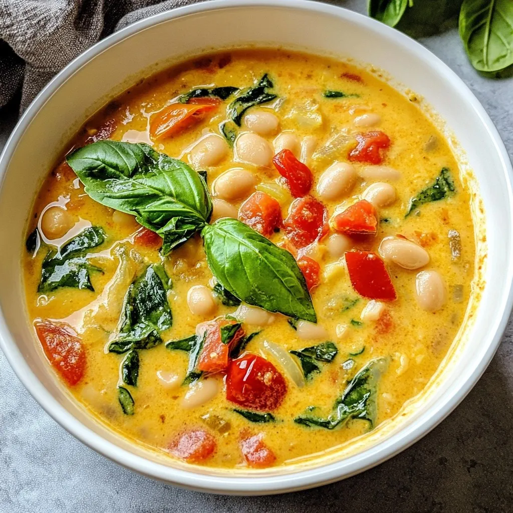 A hearty and creamy stew made with tomatoes, white beans, and fresh spinach, perfect for a comforting meal.