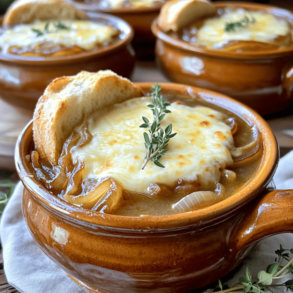 The best bread for this soup is a French baguette. Slice it into thick pieces. After broiling, the bread becomes crunchy and perfect for soaking up the soup. For garnish, use fresh thyme sprigs. They add a pop of color and flavor. Serve in oven-safe bowls for a fun touch.