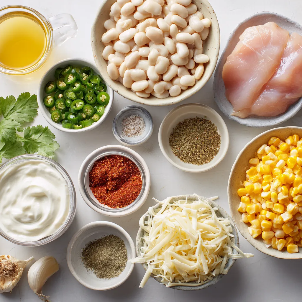 When I make this chili, I love using boneless, skinless chicken breasts. They cook well and shred easily. White beans add a creamy texture that blends perfectly with the other ingredients. Diced green chilies bring a mild heat and great flavor. Chopping onion and garlic adds depth. I often use corn for a sweet touch, and chicken broth binds all the flavors.