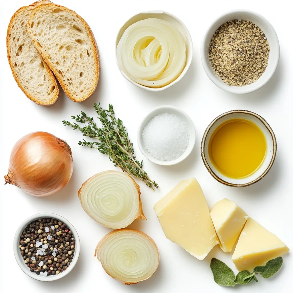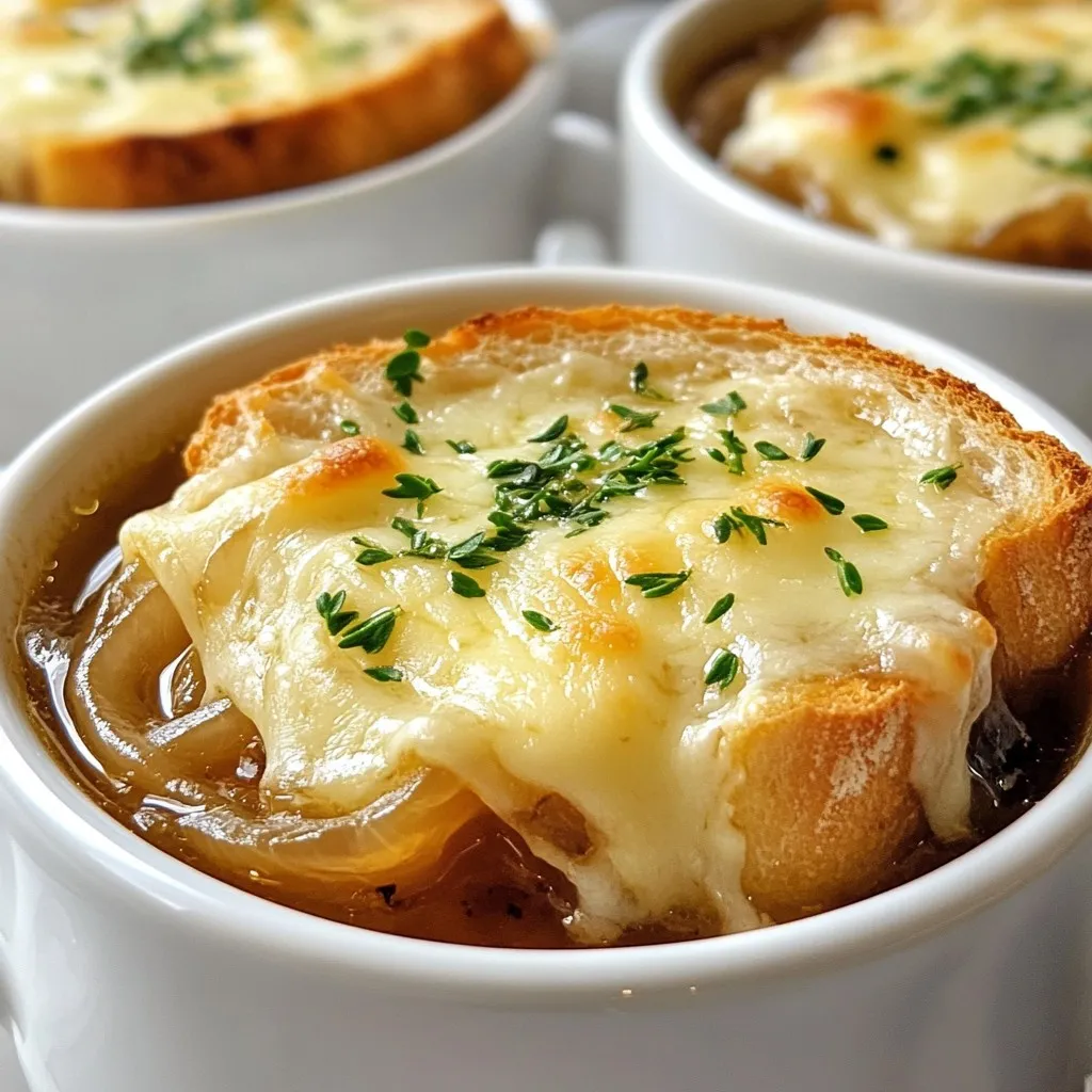 - 4 large onions, halved and thinly sliced - 4 tablespoons unsalted butter - 2 tablespoons olive oil - 1 teaspoon granulated sugar - 4 cups beef broth or vegetable broth - 1 teaspoon dried thyme or 1 tablespoon fresh thyme - 1 bay leaf - Salt and freshly ground black pepper - 1 baguette, sliced into 1-inch pieces - 1 ½ cups shredded Gruyère cheese - Fresh parsley, finely chopped, for garnish The key to a great French onion soup starts with the onions. Choose large, sweet onions for the best flavor. Their sweetness will shine through once they caramelize. The butter and olive oil blend gives a rich taste. Sugar helps the onions caramelize faster. You can use either beef broth or vegetable broth. Beef broth gives a deeper flavor, while vegetable broth works for a lighter taste. Thyme adds a lovely earthy note. Don't forget the bay leaf; it adds depth to the soup. For topping, a good baguette is essential. It should be crusty and chewy. Gruyère cheese melts beautifully, creating that signature cheesy layer. Fresh parsley not only adds color but also brightens the dish. Make sure you have all these ingredients ready. They come together to create a warm and comforting soup. {{ingredient_image_2}} - Melt butter and olive oil in a pot. - Add sliced onions and sprinkle with sugar. Start by heating your pot over medium heat. The butter and olive oil blend will add rich flavor to the soup. Once melted, toss in the thinly sliced onions. The sugar helps the onions become sweet and caramelized. Stir well to coat the onions evenly. - Cook onions slowly for 30-35 minutes. - Stir occasionally to avoid burning. Cook the onions slowly. This step takes about 30 to 35 minutes. Stir them often. This helps prevent burning and ensures even cooking. You want the onions to turn a deep, golden brown. Their sweet aroma will fill your kitchen. - Season onions and add broth with thyme and bay leaf. - Simmer uncovered for 20 minutes. Once caramelized, season your onions with salt and pepper. Next, add the broth along with thyme and a bay leaf. Stir the mixture to combine all the flavors. Increase the heat and let it simmer uncovered for about 20 minutes. This time allows all the flavors to meld together. - Toast baguette slices in a preheated oven. - Set aside for assembly. While your soup simmers, preheat your oven to 400°F (200°C). Arrange your baguette slices on a baking sheet. Toast them for 5 to 7 minutes. Flip them halfway through to ensure they brown evenly. Once done, set them aside for later. - Ladle soup into bowls and top with toasted baguette. - Broil with cheese until golden brown. Ladle the hot soup into oven-safe bowls. Place a toasted baguette slice on top of each bowl. Generously sprinkle shredded Gruyère cheese over the bread. Now, broil the bowls for 3 to 5 minutes. Watch closely as the cheese melts and turns golden brown. Enjoy the warm, comforting flavors of your French onion soup! - Use a mix of beef and vegetable broth. This adds depth and richness to the soup. The beef broth gives a meaty taste, while the vegetable broth adds a hint of sweetness. Mixing them creates a balanced flavor profile. - Experiment with different types of cheese. While Gruyère is classic, you can try Swiss, mozzarella, or even a sharp cheddar. Each cheese brings its own unique taste and texture to the soup. - Use a heavy-bottomed pot for even cooking. This helps distribute heat evenly, preventing hot spots that can burn the onions. A Dutch oven is a great choice for this task. - Stir regularly to achieve the desired color. Stir the onions every few minutes. This keeps them from sticking and ensures they caramelize evenly. You want a lovely golden-brown color, which takes time and patience. - Serve in individual French onion soup bowls. These bowls not only look nice but also allow for even cheese melting. They make each serving feel special and personal. - Garnish with fresh herbs for added flair. A sprinkle of chopped parsley on top adds a pop of color and a fresh taste. You can also use thyme or chives for a more herbal note. Pro Tips Caramelization is Key: Take your time with the onions. The longer they cook, the sweeter and more flavorful they become. Aim for a deep golden-brown color for the best results. Broth Choices Matter: For a richer flavor, use homemade beef broth. If you prefer a vegetarian option, opt for a high-quality vegetable broth that is well-seasoned. Cheese Variations: While Gruyère is traditional, you can experiment with other cheeses like Swiss or a sharp cheddar for a unique twist. Just make sure it melts well! Garnish for Freshness: Always finish with fresh herbs like parsley or chives. They add a vibrant touch and balance the richness of the soup. {{image_4}} You can easily make a vegetarian version of French onion soup. Simply substitute beef broth with vegetable broth. This swap keeps the flavor rich and satisfying. You can also add more vegetables for added texture. Try mushrooms or carrots to enhance the taste and nutrition. If you need a gluten-free option, use gluten-free bread for topping. This will ensure everyone can enjoy the soup. Also, make sure the broth is certified gluten-free. This small step helps avoid any gluten-related issues. Not everyone has Gruyère cheese on hand. If you don’t, try substitutes like mozzarella or Swiss cheese. These cheeses melt well and add a nice flavor. For extra depth, add a layer of parmesan on top. This will give your soup a delightful, cheesy crust. To keep your French onion soup fresh, cool it completely before storing. This step helps prevent moisture buildup. Use an airtight container to seal in flavors. Store the container in the refrigerator. This way, your soup can stay tasty for later. When you want to enjoy your soup again, you can reheat it easily. Use the stove for even heating or the microwave for quick warming. Just remember to cover the bowl while microwaving. For a tasty finish, toast fresh baguette slices before serving. T