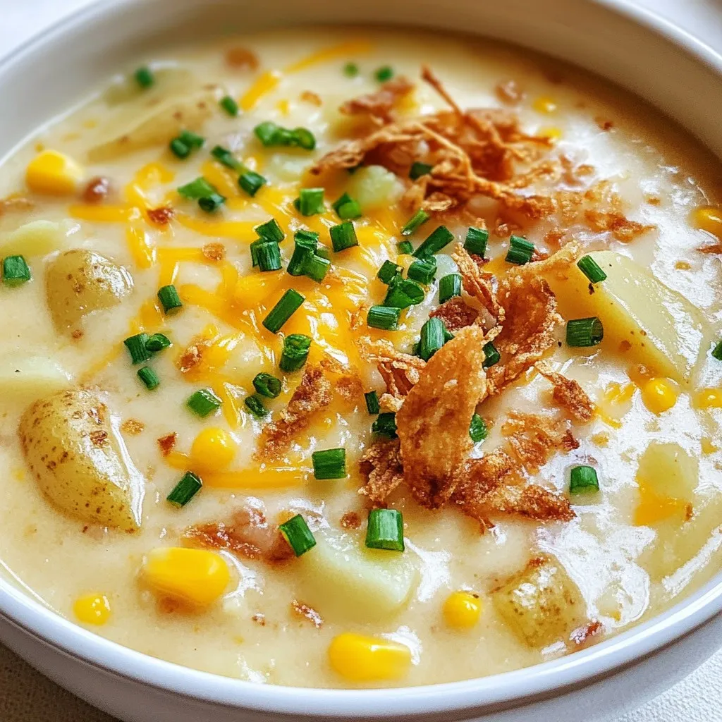 A rich and creamy potato soup with corn and carrots, perfect for a cozy meal.