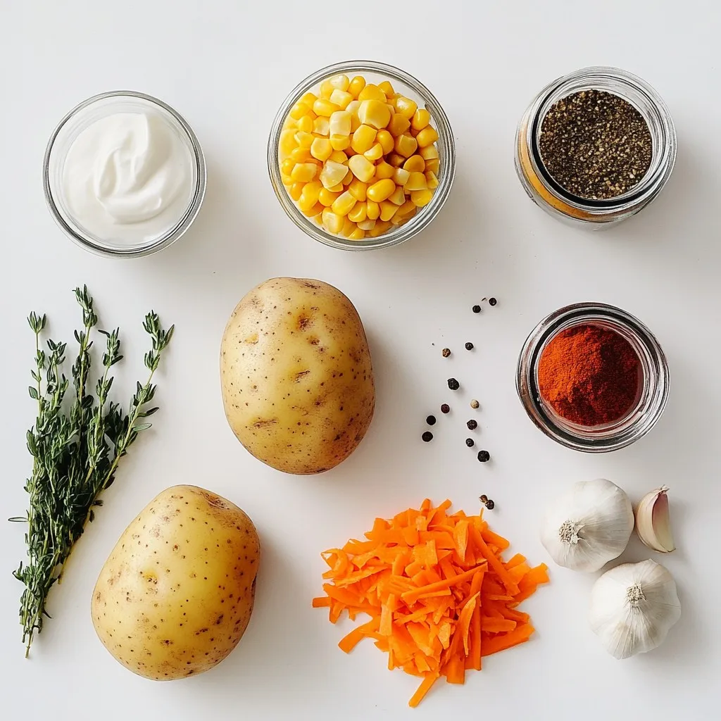 To make this potato soup, start by gathering your ingredients. You need four large russet potatoes, one medium onion, three cloves of garlic, and four cups of vegetable broth. You also need one cup of heavy cream or coconut milk, two cups of frozen corn, and one cup of shredded carrots. Lastly, grab some dried thyme, smoked paprika, salt, and black pepper.