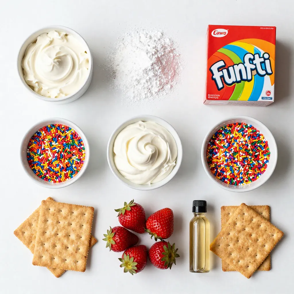 These ingredients create a creamy and sweet dip. The cream cheese gives it a rich base. The powdered sugar adds sweetness. Sour cream makes it smooth, while vanilla adds flavor. Funfetti cake mix brings that iconic birthday cake taste. Finally, rainbow sprinkles add fun and color.