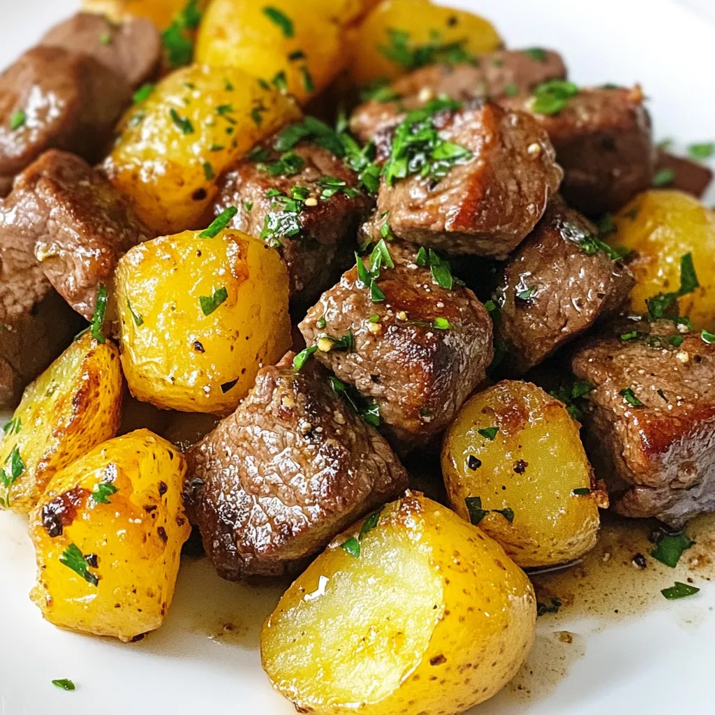 Presentation matters! Serve your garlic butter beef bites on a rustic wooden board. Arrange the crispy potatoes next to the beef for a colorful display. Garnish with fresh parsley for a pop of green. You can place a small bowl of garlic butter on the side for dipping. Pair this dish with a fresh salad or steamed vegetables. This adds a nice crunch and balances the meal.