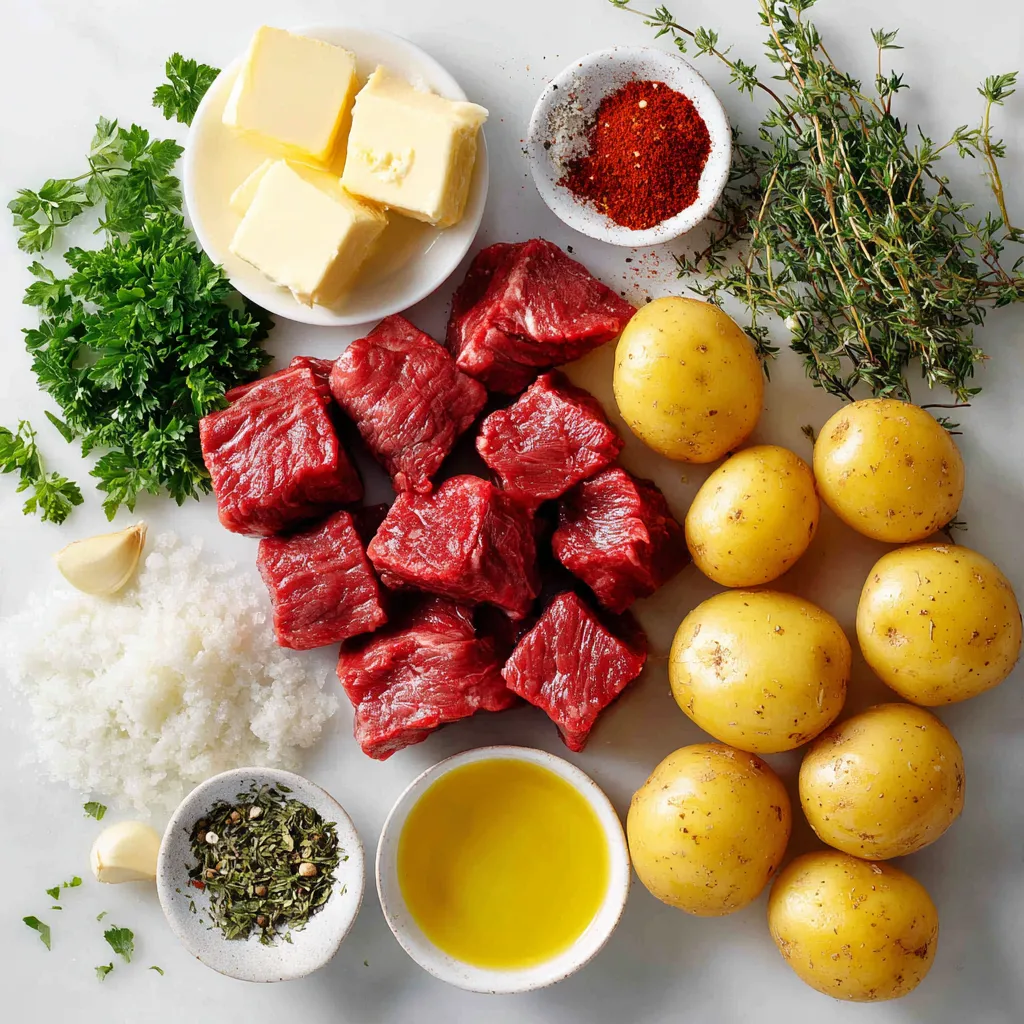 To make Garlic Butter Beef Bites with Potatoes, you’ll need the following ingredients: