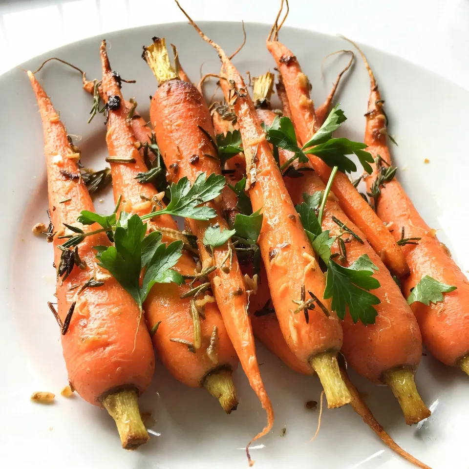 To make Garlic Herb Roasted Carrots, gather these simple ingredients: - 1 pound baby carrots, thoroughly washed and trimmed - 3 tablespoons extra virgin olive oil - 4 cloves garlic, finely minced - 1 teaspoon dried thyme - 1 teaspoon dried rosemary - 1 teaspoon coarse sea salt - ½ teaspoon freshly ground black pepper - Fresh parsley, finely chopped (for garnishing) These ingredients create a flavorful dish. Baby carrots provide natural sweetness. Olive oil helps the herbs stick and adds richness. Garlic gives the dish a lovely aroma. Dried thyme and rosemary add depth to the flavor. Sea salt enhances all the tastes, while black pepper adds a hint of spice. Finally, fresh parsley brightens the dish and makes it look beautiful. When you combine these ingredients, you create a tasty side that pairs well with many meals. Use this recipe to impress your family or guests. The vibrant colors and inviting scents will surely draw everyone in. {{ingredient_image_2}} 1. Preheat the oven Start by preheating your oven to 425°F (220°C). This heat will help the carrots roast well. 2. Prepare the marinade In a big bowl, mix 3 tablespoons of olive oil, 4 minced garlic cloves, 1 teaspoon each of thyme and rosemary, 1 teaspoon of sea salt, and ½ teaspoon of black pepper. Whisk until it’s all combined. The mixture should smell amazing. 3. Coat the carrots Add 1 pound of baby carrots to the bowl. Toss them well in the marinade. Make sure every carrot gets a nice coat. This is where the flavor starts to build. 1. Arrange on baking sheet Line a baking sheet with parchment paper. Spread the marinated carrots in a single layer. Leave some space between each carrot to help them roast evenly. 2. Oven roasting details Place the baking sheet in your hot oven. Roast the carrots for 25-30 minutes. This time will make them tender and give them a nice caramelized look. 3. Stirring midway for even cooking Halfway through roasting, take the sheet out and gently stir the carrots. This helps them cook evenly and get that golden color all around. 1. Serving suggestions Once the carrots are done, take them out of the oven. Place them on a serving platter. This dish looks great on any table. 2. Garnishing with parsley Finish with a sprinkle of fresh parsley. This adds a pop of color and fresh taste. Your Garlic Herb Roasted Carrots are now ready to enjoy! To get tender carrots, aim for baby carrots. They cook faster and have great flavor. If you use larger carrots, cut them into smaller pieces. This helps them roast evenly. Always wash and trim your carrots before cooking. It makes a big difference in taste. Herbs can change the taste of your dish. If you don't have thyme or rosemary, try oregano or basil. Both work well with carrots. You can also add other vegetables. Sweet potatoes or parsnips roast nicely with carrots. Mix them for a colorful dish. For serving, choose a rustic wooden bowl. It adds a warm, homey feel. You can also use a colorful ceramic dish to show off the bright orange of your carrots. When plating, try stacking the carrots in a fan shape. This makes your dish look fancy and inviting. Pro Tips Choose Fresh Carrots: Opt for fresh, vibrant baby carrots for the best flavor and texture. Look for ones that are firm and free from blemishes. Experiment with Herbs: Feel free to swap out the dried thyme and rosemary for other herbs like dill or oregano to customize the flavor profile to your liking. High Heat is Key: Roasting at a high temperature caramelizes the natural sugars in the carrots, enhancing their sweetness and creating a lovely golden color. Don’t Overcrowd the Pan: Give each carrot enough space on the baking sheet to ensure they roast evenly and achieve that desired crispness. {{image_4}} You can change the flavor of your carrots by using different herbs. An Italian herb blend adds a nice twist. Mix in oregano, basil, and marjoram for a delicious taste. Using fresh herbs can make your dish even tastier. Fresh thyme or rosemary gives a bright flavor that dried herbs can’t match. Just remember to use more fresh herbs than dried. A good rule is three times the amount. Adding a touch of sweetness can enhance the flavor of your roasted carrots. Honey or maple syrup can add a lovely glaze. Just drizzle a bit over the carrots before roasting. You can also mix in other root vegetables. Think parsnips or sweet potatoes. This adds variety and texture to your dish. Just cut them to the same size as your carrots. If you love heat, try adding chili flakes. A pinch can bring a nice kick to your dish. Just be careful not to add too much. Adding citrus zest can brighten up the flavor. Lemon or orange zest can add a fresh taste that pairs well with the garlic. Just sprinkle some on after roasting for a zesty finish. After making Garlic Herb Roasted Carrots, let them cool first. Store leftovers in an airtight container. They stay fresh in the fridge for up to four days. When you're ready to eat, reheat them in the oven at 350°F (175°C) for about 10 minutes. This way, they regain some of their crispy texture. You can freeze roasted carrots if you want to keep them longer. First, let them cool completely. Spread them out on a baking sheet in a single layer. Freeze for about two hours, then transfer them to a freezer bag. Remove as much air as you can to prevent freezer burn. For thawing, take them out a day before and place them in the fridge. You can also reheat them directly from the freezer in the oven. Garlic Herb Roasted Carrots stay fresh for four days in the fridge. If you freeze them, they last for about three months. Check for signs of spoilage, like mold or an off smell. If they look or smell bad, throw them away. Always trust your senses when it comes to food safety. Yes, you can use regular carrots. Just peel and cut them into sticks. Aim for sizes similar to baby carrots. This helps them roast evenly. Regular carrots add good flavor. Roasted carrots can last for about 3 to 5 days in the fridge. K
