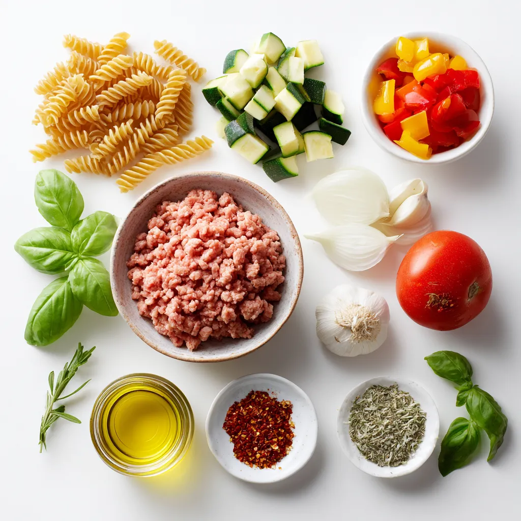 The garlic and onion create a fragrant base. They enhance the dish’s depth. Bell peppers and zucchini add color and crunch. Canned diced tomatoes form the sauce. They provide moisture and tang. Oregano and basil bring classic Italian flavors, while red chili flakes add a kick.