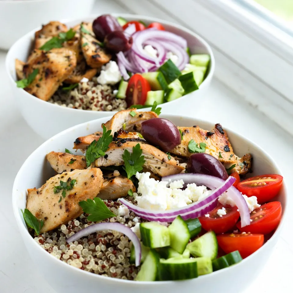 A vibrant and flavorful bowl featuring marinated grilled chicken, quinoa, fresh vegetables, and feta cheese.