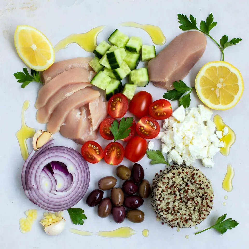 On top of the quinoa, artfully arrange the sliced grilled chicken, diced cucumber, halved cherry tomatoes, thinly sliced red onion, crumbled feta cheese, and sliced kalamata olives to create vibrant layers.