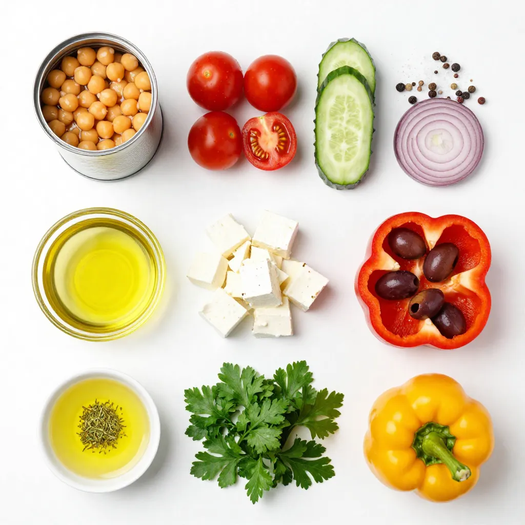 A refreshing salad featuring chickpeas, feta cheese, and a variety of fresh vegetables, dressed with a zesty olive oil and lemon dressing.