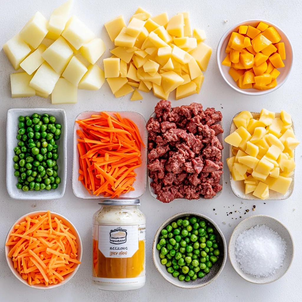 The main ingredients for this casserole create a hearty dish. Ground beef gives the meal its protein. Potatoes provide a filling base with a creamy texture. Onions and garlic add depth and flavor. Mixed vegetables bring in color and nutrients. Cheese melts perfectly on top, making it delicious. Beef broth ties everything together, keeping it moist.