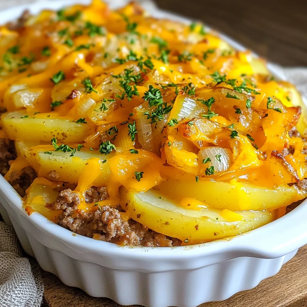 A hearty casserole featuring layers of ground beef, potatoes, and cheese, perfect for a family meal.