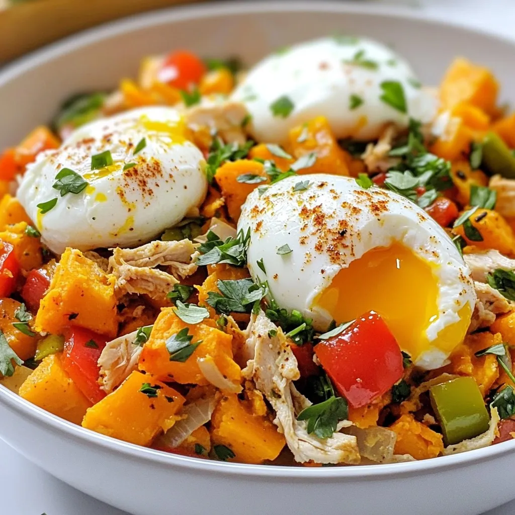 A hearty and flavorful dish featuring shredded chicken, sweet potatoes, and colorful bell peppers, topped with eggs if desired.