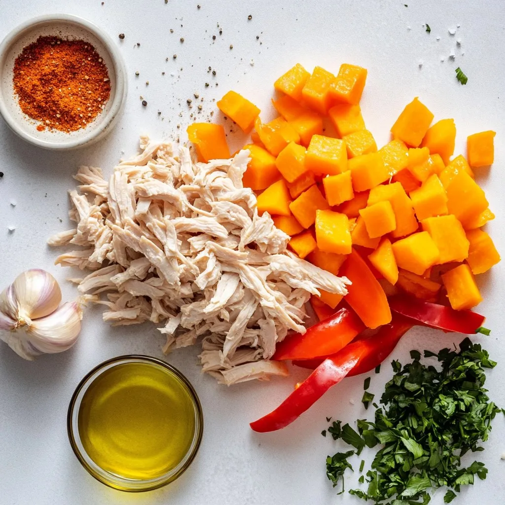 Start by gathering all your ingredients. You will need cooked chicken, sweet potatoes, and veggies. Dice the sweet potatoes into small cubes, about ½ inch. Chop the red and green bell peppers. Finely chop the onion. Mince the garlic.