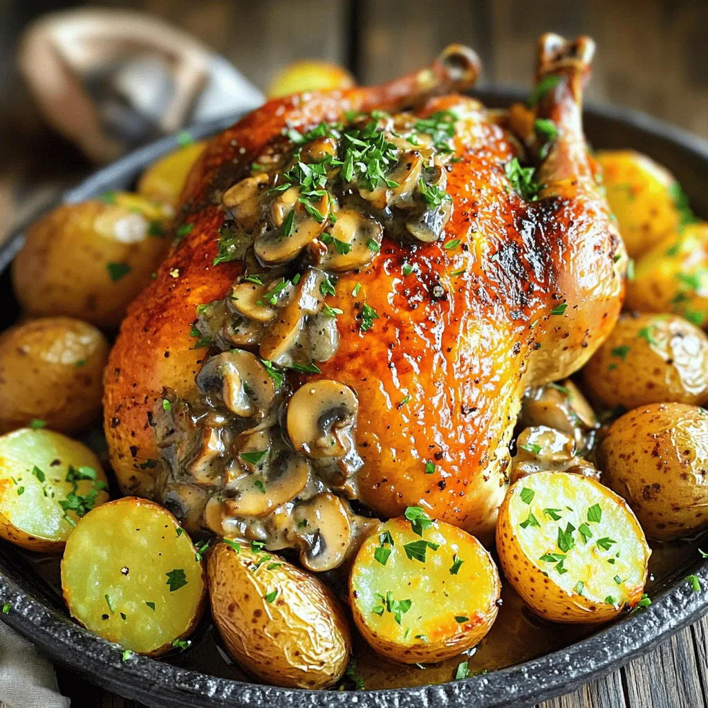- Whole chicken (4-5 pounds) - Olive oil - Garlic powder - Onion powder - Fresh rosemary and thyme - Baby potatoes - Mushrooms - Heavy cream - Grated Parmesan cheese - Fresh parsley This dish combines simple, fresh ingredients to create rich flavors. The star is a whole chicken, weighing about 4 to 5 pounds. This size ensures that it stays juicy while cooking. I use olive oil, garlic powder, and onion powder to create a tasty herb paste. Fresh rosemary and thyme add that garden-fresh taste, making the chicken fragrant. For the creamy mushroom potatoes, I pick baby potatoes for their tender texture. Sliced mushrooms add an earthy flavor that pairs well with the creamy sauce. Heavy cream is the key to rich comfort. Finally, grated Parmesan cheese gives a savory kick. Fresh parsley is a must for garnish; it adds color and a hint of freshness. This dish is not only delicious but also visually appealing. - Preheat the oven to 425°F (220°C). This helps the chicken roast perfectly. - Pat the chicken dry. This step helps the skin turn crispy. Mix 2 tablespoons of olive oil, garlic powder, onion powder, chopped rosemary, chopped thyme, salt, and pepper in a bowl. This will be your herb paste. Rub it all over the chicken. Make sure to get some under the skin for great flavor. - Cut the lemon in half. Squeeze the juice into the chicken cavity. Place the lemon halves inside too. This adds a nice citrus scent while it cooks. - Take the halved baby potatoes and place them in a bowl. Drizzle with olive oil, salt, and pepper. Toss them well. Spread the potatoes around the chicken in the roasting pan. Make sure they have space to cook evenly. - Put the chicken in the oven. Roast for about 1 hour. The internal temperature should reach 165°F (75°C) for safety. The skin should be a lovely golden brown. - While the chicken cooks, heat a splash of olive oil in a skillet over medium heat. Add the sliced mushrooms and sauté for 5-7 minutes until they are soft and brown. - Pour in the heavy cream. Stir well to mix with the mushrooms. Let it simmer gently. Then, add the grated Parmesan cheese. Taste the sauce and adjust the salt and pepper if needed. Let it simmer for a few minutes until it thickens nicely. How to ensure crispy skin? To get crispy skin, start with a dry chicken. Pat it well with paper towels. This helps the skin brown nicely. Use olive oil to coat the chicken. The oil adds flavor and helps the skin crisp up. Rub the herb paste under the skin for extra taste. Roast at a high temperature of 425°F (220°C) for best results. This will help the skin turn golden and crunchy. Importance of resting the chicken after roasting Resting the chicken is key. After roasting, let it sit for 10-15 minutes. This helps the juices stay inside the meat. If you cut it too soon, the juices run out. This makes the chicken dry. Resting keeps it juicy and tender. Adjusting seasoning for taste When making the creamy mushroom sauce, taste as you cook. Start with salt and pepper. You can always add more if needed. If it tastes bland, try adding a splash of lemon juice. This brightens the flavors. Fresh herbs can also enhance the taste. Variations with different mushrooms You can use many types of mushrooms for the sauce. Button mushrooms are common but try cremini or shiitake for more flavor. Mixing different mushrooms adds depth. Each type gives a unique taste. Explore what you like best! {{image_4}} If you want to change things up, consider using different herbs. Instead of rosemary and thyme, you can try oregano or basil. These herbs bring a new flavor to the dish. You can also switch the type of potatoes. Baby potatoes are great, but Yukon Gold or red potatoes work well too. They add different textures and tastes to the meal. To make this dish gluten-free, check your ingredients. The chicken and the herbs are naturally gluten-free. Just be cautious with any sauces or broths you might use. For a dairy-free version, you can replace the heavy cream. Use coconut milk or cashew cream instead. These alternatives still give a creamy texture without dairy. To keep your Herb Roasted Chicken fresh, follow these simple steps: - Refrigeration: Place leftover chicken and potatoes in an airtight container. Store them in the fridge for up to 3 days. - Freezing Portions: If you want to freeze the chicken, slice it first. Wrap each piece tightly in plastic wrap, then place them in a freezer bag. This helps prevent freezer burn. You can freeze the creamy mushroom sauce in a separate container for up to 3 months. To enjoy your leftovers without losing flavor, use these methods: - Reheating Chicken: Preheat your oven to 350°F (175°C). Place the chicken on a baking sheet and cover it with foil. This keeps the chicken moist while heating. Bake for about 20-25 minutes or until warm. - Reheating Creamy Mushroom Sauce: Heat the sauce in a small pot over low heat. Stir often to avoid burning. If it thickens too much, add a splash of milk or cream to restore its creaminess. How long to cook a whole chicken? You should roast a whole chicken for about one hour. This timing works well for a chicken weighing 4 to 5 pounds. Check the internal temperature. It should reach 165°F (75°C) in the thickest part. If you do not have a thermometer, a good rule is to cook it for 20 minutes per pound. What temperature to roast chicken for moist results? Roast chicken at 425°F (220°C). This high heat helps the skin become crispy while keeping the meat juicy. The hot oven cooks the chicken evenly, giving it a nice golden color. Can I use different types of mushrooms? Yes, you can use many kinds of mushrooms. Button, cremini, or shiitake mushrooms all work well. Each type adds its own flavor. Feel free to mix them for a richer taste. How to thicken the creamy sauce? To thicken the creamy sauce, let it simmer longer. The heat will help reduce it. If you want it thicker faster, add a bit of cornstarch mixed with water. Stir it in until it reaches your desir
