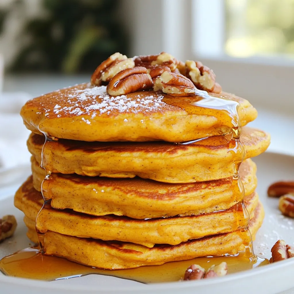 For an appealing presentation, stack the pancakes high on a serving plate. Drizzle with additional maple syrup and finish with a light dusting of pumpkin pie spice. For a delightful crunch, add a handful of toasted pecans or walnuts on top before serving.