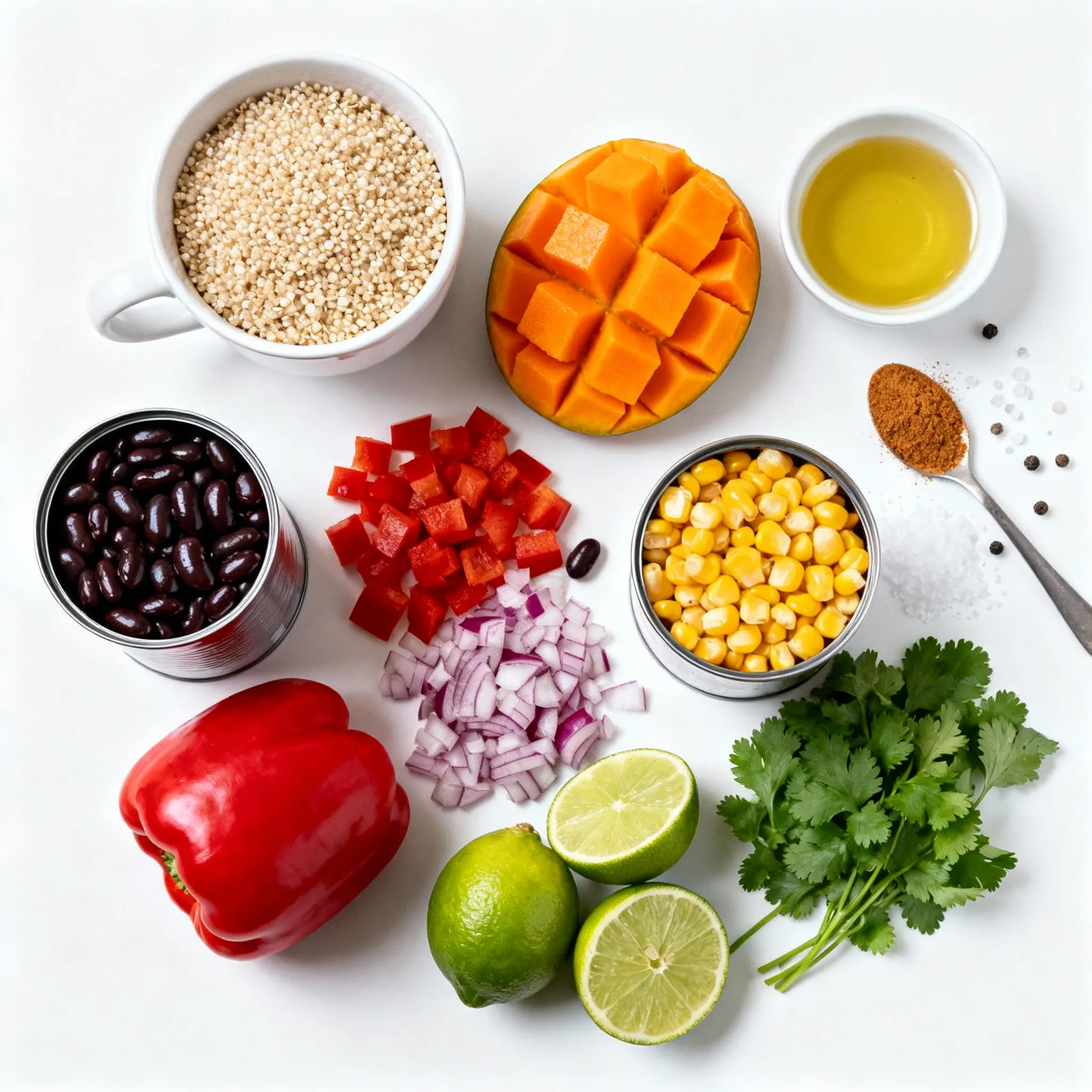 - 1 cup quinoa, thoroughly rinsed under cold water - 2 cups water or vegetable broth (for extra flavor) - 1 ripe mango, peeled and diced into bite-sized cubes - 1 can (15 oz) black beans, drained and thoroughly rinsed - 1 red bell pepper, finely diced - 1 small red onion, finely chopped - 1 cup corn (can use fresh kernels, frozen, or canned) - 1/4 cup fresh cilantro, chopped coarsely - Juice of 2 limes (about 1/4 cup) - 2 tablespoons extra virgin olive oil - 1 teaspoon ground cumin - Sea salt and freshly ground black pepper, to taste In this salad, quinoa stands out as the main ingredient. It adds a nice texture and a boost of protein. The bright mango adds sweetness, while black beans provide fiber and protein. Fresh veggies like bell pepper and onion give crunch and flavor. Corn adds a pop of sweetness and color. The dressing ties everything together. It combines lime juice, olive oil, cumin, salt, and pepper. This mix brightens the salad and enhances all the flavors. If you want to switch things up, try different grains. Brown rice or farro work well in this recipe. You can also use other beans, like chickpeas or kidney beans. Feel free to add more veggies. Chopped cucumber or shredded carrots can add more crunch. You might like to toss in some grilled chicken or shrimp for extra protein. You can change the dressing too. Swap lime juice for lemon juice or add some honey for sweetness. A dash of hot sauce can add a kick! {{ingredient_image_2}} First, rinse the quinoa. This step removes the bitter coating called saponin. Use a fine mesh strainer. Rinse it under cold water for about a minute. Next, choose your cooking method. You can use water or vegetable broth. Using broth adds more flavor to the quinoa. In a medium saucepan, add 1 cup of rinsed quinoa and 2 cups of your choice of liquid. Bring it to a boil on medium-high heat. Once boiling, reduce the heat to low. Cover the pan with a lid and let it simmer. Cook for 15-20 minutes until all the liquid absorbs. Once done, remove it from the heat and let it cool slightly. While the quinoa cools, prepare the salad ingredients. Start by dicing the ripe mango into small cubes. Next, finely dice the red bell pepper and chop the red onion. Open the can of black beans and drain them. Rinse the beans under cold water. Then, measure out 1 cup of corn. You can use fresh, frozen, or canned corn. In a large mixing bowl, combine the diced mango, black beans, corn, red bell pepper, red onion, and chopped cilantro. Gently toss these ingredients to mix them well. Now, let’s make the dressing. In a small bowl, whisk together the juice of 2 limes, 2 tablespoons of olive oil, and 1 teaspoon of ground cumin. Add a pinch of sea salt and black pepper to taste. Mix until all the ingredients are combined. Once the quinoa has cooled to room temperature, use a fork to fluff it. Break apart any clumps. Add the fluffed quinoa to the bowl with the other salad ingredients. Drizzle the dressing over the salad and gently toss everything together. Make sure all the ingredients are coated well. Now, taste the salad. Adjust the seasoning if needed, adding more salt, pepper, or lime juice for extra flavor. For the best taste, cover the salad and chill it in the fridge for at least 30 minutes. This time helps the flavors blend and develop. To get quinoa just right, rinse it well. Rinsing removes the bitter coating. Use a fine mesh strainer for this. Cook the quinoa in water or vegetable broth for taste. To avoid mushy quinoa, stick to the 2:1 ratio of water to quinoa. Bring it to a boil, then reduce the heat. Cover and let it simmer for 15-20 minutes. After cooking, let it cool a bit. Fluff it with a fork gently. This helps to separate any clumps. Marinating adds depth to your salad. You can soak the black beans in lime juice for 30 minutes. This gives them a bright flavor. When mixing the dressing, taste as you go. If it’s too tart, add a pinch of sugar. If you need more heat, add a dash of cayenne. Adjust salt and pepper to suit your taste too. For a stunning presentation, use a large, colorful bowl. This makes your salad pop! Garnish with extra cilantro leaves for freshness. Add lime wedges for a splash of color. This makes each serving look inviting and fresh. Enjoy the vibrant mix of flavors and colors! Pro Tips Perfectly Cooked Quinoa: Rinse the quinoa thoroughly before cooking to remove the bitter saponins. This ensures a fluffy and delicious texture. Fresh Mango Selection: Choose a ripe mango that gives slightly when pressed. This indicates it is sweet and ready to be diced. Flavor Boost: For an extra flavor kick, consider adding a pinch of cayenne pepper or diced jalapeños to the salad for a spicy twist. Meal Prep Friendly: This salad stores well in the fridge for up to 3 days, making it a perfect option for meal prep. Just give it a good stir before serving. {{image_4}} You can add grilled chicken or shrimp to this salad. This makes the dish heartier and adds a nice flavor. Simply cook the meat until it's golden, then slice or cube it. Toss it in with the salad right before serving. If you're looking for a plant-based option, try tofu or tempeh. Both options soak up flavors well. For tofu, use firm or extra-firm types. Cut them into cubes and pan-fry until crispy. For tempeh, steam it first, then slice and sauté. This adds a great crunch and protein boost. Fresh seasonal fruits or vegetables can change the salad's taste. In summer, add diced peaches or strawberries for a sweet twist. In fall, roasted sweet potatoes or butternut squash work well. They add warmth and earthiness. You can get creative with each season. In winter, try adding pomegranate seeds for a pop of color. In spring, fresh herbs like basil or mint can brighten the dish. This keeps your salad exciting all year round. You can switch up the dressing for different flavors. Try using balsamic vinegar instead of lime juice for a tangy twist. Apple cider vinegar also adds a nice zing. For oils, s