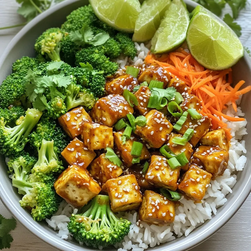 Gently return the crispy tofu to the skillet. Toss the tofu in the chili garlic sauce for 2 to 3 minutes. Ensure everything is heated through and well-coated. To assemble your bowls, start with a scoop of cooked jasmine rice. Layer the chili garlic tofu on top of the rice. Add vibrant steamed broccoli and crunchy shredded carrots. For garnish, sprinkle sliced green onions and fresh cilantro leaves on top. Don’t forget sesame seeds for a nice crunch. Serve the bowls with lime wedges on the side. This adds a fresh burst of flavor when squeezed over the dish.