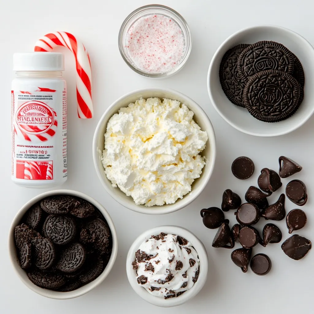 To make these no-bake peppermint Oreo bars, you need simple ingredients. Start with 24 Oreo cookies. You will crush them into fine crumbs. The crumbs create a tasty crust that holds everything together.
