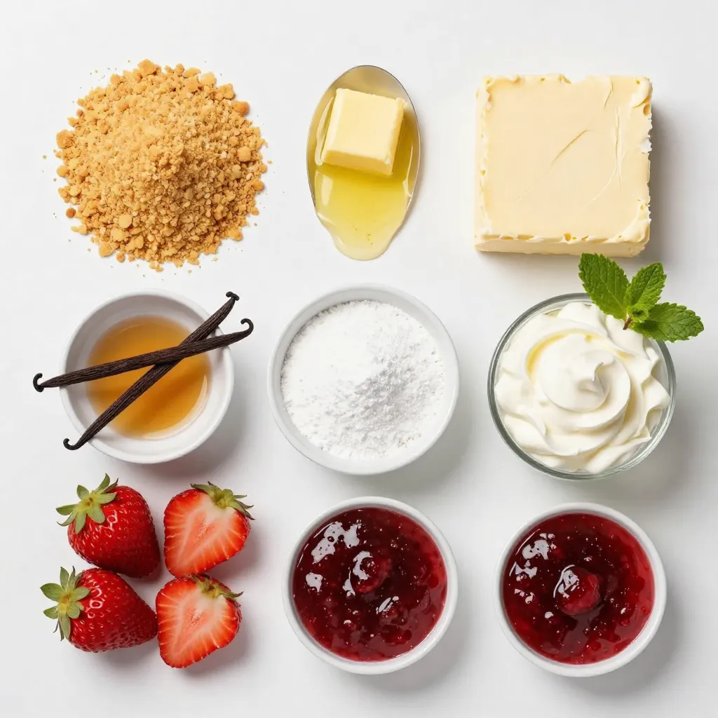 These ingredients create a rich and creamy cheesecake. The digestive biscuit crumbs give the crust a nice crunch. Unsalted butter helps hold it all together. Cream cheese adds a smooth texture. Powdered sugar sweetens the filling perfectly. Vanilla extract enhances the flavor. Chilled heavy cream makes the filling light and fluffy. Fresh strawberries add a burst of fruity goodness. Strawberry jam gives a sweet glaze on top. Finally, mint leaves add a touch of color and freshness.