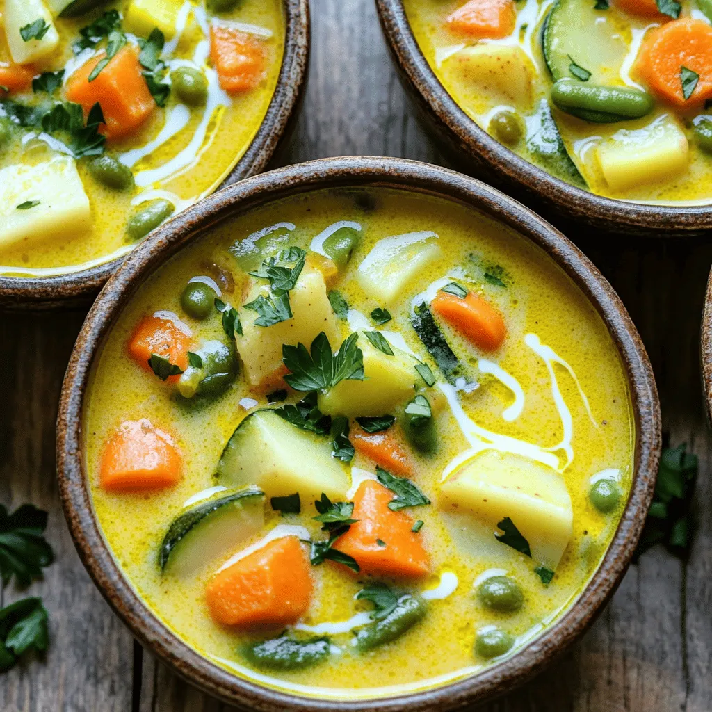 ![To make One Pot Creamy Vegetable Soup, you need simple, fresh ingredients. Here’s what you will need: - 1 tablespoon olive oil - 1 medium onion, finely chopped - 2 cloves garlic, minced - 2 medium carrots, peeled and diced - 2 stalks celery, diced - 1 medium zucchini, diced - 1 cup potatoes, peeled and cut into small cubes - 1 cup green beans, trimmed and cut into 1-inch pieces - 4 cups vegetable broth (homemade or store-bought) - 1 cup coconut milk (substitute with heavy cream for a richer flavor) - 1 teaspoon dried thyme - 1 teaspoon smoked paprika - Salt and black pepper to taste - Fresh parsley, chopped (for garnish) Each ingredient plays a key role. The olive oil helps to sauté the onion and garlic, creating a flavorful base. The onion gives sweetness, while garlic adds depth. Carrots and celery add a crunchy texture. Zucchini and potatoes bring heartiness, and green beans add freshness. Vegetable broth forms the soup's liquid, making it rich in flavor. Coconut milk makes it creamy, and you can switch to heavy cream for a more decadent taste. Dried thyme and smoked paprika enhance the soup's profile, while salt and pepper balance the flavors. Finally, fresh parsley brightens up the dish, making it a feast for the eyes too. For a full recipe, check out the [Full Recipe]. First, heat 1 tablespoon of olive oil in a large pot over medium heat. Add 1 medium onion, finely chopped, and sauté until it turns translucent. This should take about 3 to 4 minutes. Next, add 2 cloves of minced garlic and cook for an additional minute. The garlic should smell fragrant and golden at this stage. Now, mix in 2 medium carrots, peeled and diced; 2 stalks of celery, diced; and 1 cup of potatoes, peeled and cut into small cubes. Sauté these root vegetables for about 5 minutes. This softens them and helps release their flavors. Next, stir in 1 medium zucchini, diced, and 1 cup of green beans, trimmed and cut into 1-inch pieces. Cook everything together until the green beans turn vibrant in color. This should take about 2 to 3 minutes. Pour in 4 cups of vegetable broth. Bring the mixture to a rolling boil. Once boiling, reduce the heat to low and let it simmer gently for about 15 minutes. The goal is to make the vegetables tender when pierced with a fork. Now comes the fun part! Use an immersion blender to blend the soup until it reaches your desired creaminess. If you like a chunkier soup, blend only half or pulse it a few times. Return the pot to low heat. Stir in 1 cup of coconut milk, 1 teaspoon of dried thyme, and 1 teaspoon of smoked paprika. Season generously with salt and black pepper. Allow the soup to warm through for about 5 minutes, stirring occasionally. Once ready, ladle the creamy vegetable soup into warm bowls. Top each serving with a sprinkle of fresh chopped parsley. This adds a nice pop of color and fresh flavor. Enjoy this comforting dish by following the Full Recipe! - Add heavy cream for extra richness. - Blend half the soup for a smooth and creamy texture. To make your soup even creamier, consider adding heavy cream. This rich addition brings a velvety feel that takes the soup to the next level. If you want some texture, blend just half the soup. This gives you a mix of creamy and chunky bites, making every spoonful exciting. - Use dairy-free alternatives like almond milk or oat milk for coconut milk. - Swap vegetables based on what’s fresh and in season. If you need a dairy-free option, try almond or oat milk instead of coconut milk. It adds a nice flavor without the dairy. You can also change up the veggies based on what you find at the market. Carrots, peas, or even squash can work great, making the soup unique each time. - Use a large pot for even cooking. - An immersion blender makes clean-up easy. A large pot helps everything cook evenly. You want all the veggies to soften at the same rate. An immersion blender is a game changer. It lets you blend the soup right in the pot, which means less mess and easy clean-up. Trust me, it saves time and effort! For the Full Recipe, check the earlier section to get all the steps in one place. {{image_4}} You can boost the nutrition of your soup. Add beans or lentils for more protein. These ingredients not only fill you up but also add a lovely texture. If you want more flavor, try cooked chicken or tofu. Both options enhance the soup's taste while keeping it creamy. Do you like a little heat? Add chili flakes to your soup for a kick. You can also mix in herbs like basil or oregano. These spices will make your soup taste fresh and exciting. Feel free to adjust the amount to match your taste. If you want a different creamy taste, try other dairy-free milk options. Almond or oat milk can work well. For unique flavors, use pureed roasted vegetables. This adds depth to your soup and keeps it interesting. Check out the Full Recipe for more tips on making your soup perfect. To keep your soup fresh, let it cool down first. This step is key. Once cooled, pour the soup into airtight containers. This helps keep the flavors intact. Store it in the fridge for up to 4 days. If you want to save some for later, freezing works great! Pour the cooled soup into freezer-safe bags or containers. Make sure to leave some space, as liquids expand when frozen. It can last up to 3 months in the freezer. When you're ready to eat, thaw it overnight in the fridge for best results. Reheating your soup is easy. For the best taste, heat it on the stove over medium heat. Stir often to avoid burning. If you’re in a rush, the microwave works too. Just heat in short bursts, stirring in between. This helps keep the creamy texture and flavor. Enjoy your soup warm! Yes, you can make this soup ahead of time. Prepare the soup and let it cool. Store it in an airtight container in the fridge. It will stay fresh for about three days. When you're ready to eat, just reheat it on the stove or in the microwave. This soup goes well with several sides. Here are some ideas: - Crus