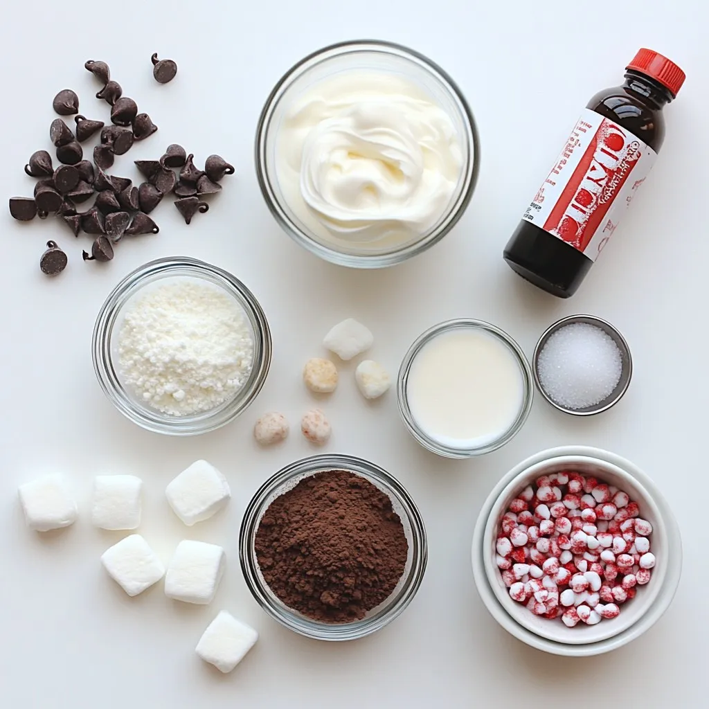 Gather these simple ingredients to create your peppermint hot cocoa chocolate mousse cups. Each item plays a key role in building rich flavor and a smooth texture. The heavy whipping cream gives a fluffy base, while the semi-sweet chocolate chips provide a deep chocolate taste. Whole milk keeps the mousse creamy, and granulated sugar adds sweetness. Unsweetened cocoa powder intensifies the chocolate flavor, while pure vanilla and peppermint extracts bring warmth and festive cheer.