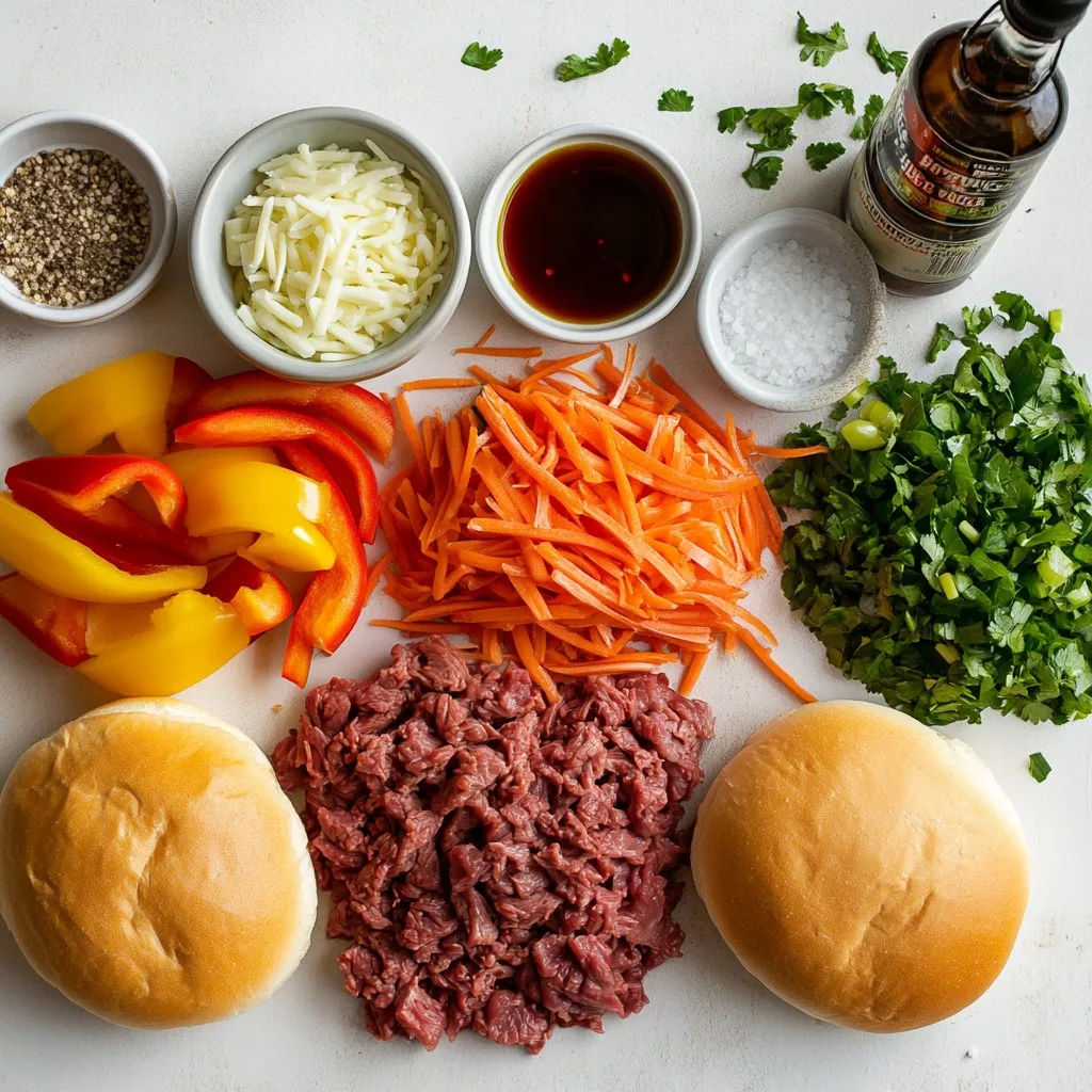 The ingredients for Philly Cheesesteak Sloppy Joes bring bold flavors and comfort to your plate. Start with ground beef and beef steak for a rich meat base. The steak adds a nice texture and depth.