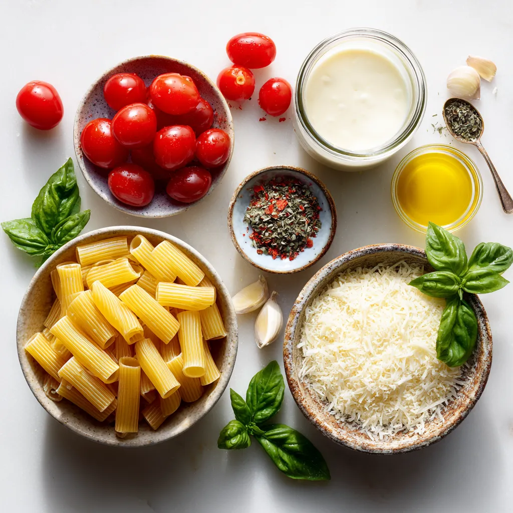 These main ingredients create a rich and creamy dish. The radiatore pasta holds sauce well, making each bite tasty. Heavy cream adds a smooth texture. Parmesan cheese brings a salty flavor. Cherry tomatoes add freshness and color. Garlic gives an aromatic touch. Olive oil helps cook the garlic. Dried basil adds an herbal note.
