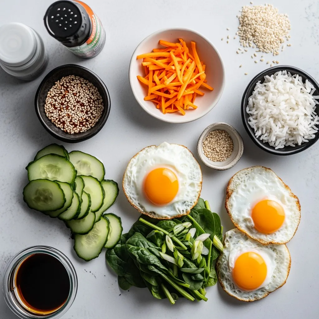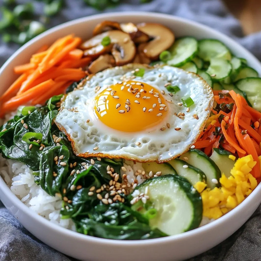 - 2 cups cooked white rice - 1 cup fresh spinach, blanched - 1 cup carrots, julienned - 1 cup cucumber, julienned - 1 cup bean sprouts, blanched - 1 cup shiitake mushrooms, sliced - 2 large eggs - 2 tablespoons sesame oil (divided) - 2 tablespoons gochujang (Korean chili paste) - 1 tablespoon soy sauce - 1 tablespoon toasted sesame seeds - Salt and pepper to taste - Chopped green onions, for garnish You can add a variety of ingredients to your bibimbap. Some great options include: - Sliced radishes - Zucchini, julienned - Kimchi for extra flavor - Chicken, beef, or tofu for protein These additions let you make the dish your own. Using high-quality ingredients is key to a great bibimbap. Fresh vegetables give a crisp and vibrant taste. Choose bright, firm veggies for the best flavor. Good rice ensures a nice base. I recommend using short-grain rice for its sticky texture. Authentic gochujang adds depth and flavor. Quality sesame oil enhances the aroma. Always aim for the best, and your bibimbap will shine! {{ingredient_image_2}} First, bring a pot of water to a boil. Blanch the spinach and bean sprouts for 1-2 minutes. After that, drain them and let them cool. In a non-stick pan, heat 1 tablespoon of sesame oil over medium heat. Add the sliced shiitake mushrooms. Sauté them for about 3-4 minutes until they are tender. Season with salt and pepper before removing them from the pan. Next, add the julienned carrots to the same pan. Sauté these for 2-3 minutes until they soften a bit but stay crunchy. Set them aside when done. Finally, add the julienned cucumber to the pan. Sauté briefly for 1-2 minutes just to warm it up, then set aside. In a small skillet, drizzle some sesame oil and heat it over low heat. Carefully crack in two large eggs. Fry them sunny-side up or to your liking. As they cook, sprinkle a pinch of salt on top for flavor. Grab a large serving bowl. Place a generous portion of cooked white rice as the base. Neatly arrange the blanched spinach, sautéed mushrooms, carrots, cucumbers, and bean sprouts around the rice. This creates a colorful and inviting display. Next, gently place the fried egg on top of the rice. Drizzle the remaining tablespoon of sesame oil and soy sauce over the dish. This adds depth of flavor. Serve it with gochujang on the side, so each person can add spice to their taste. Finally, sprinkle toasted sesame seeds and chopped green onions to boost flavor and visual appeal. To make perfect bibimbap, focus on cooking each ingredient well. Blanch the spinach for just 1-2 minutes. This keeps it bright and crunchy. Sauté the shiitake mushrooms until tender, about 3-4 minutes. Add salt to enhance their flavor. Cook the carrots for 2-3 minutes. They should be soft but still have a nice bite. When sautéing cucumbers, just warm them for 1-2 minutes. This keeps their fresh taste. Many skip blanching the bean sprouts and spinach. This step adds flavor and keeps veggies vibrant. Don’t overcook the carrots; they should still be a bit crunchy. Using too much gochujang can overpower the dish. Start with a small amount and add more if needed. Remember to season each layer as you cook. This builds flavor in every bite. Presentation matters in bibimbap. Use deep bowls to show off the colorful layers. Place rice at the bottom, then arrange veggies around it. Keep each ingredient in its own section for a beautiful look. Add a fried egg on top for a nice touch. Drizzle with sesame oil and soy sauce for extra flavor. Finally, sprinkle with sesame seeds and green onions. Serve with gochujang on the side so everyone can adjust the spice. Pro Tips Use Day-Old Rice: For the best texture, use day-old rice that has been stored in the fridge. This helps to prevent the rice from becoming too mushy when mixed with the vegetables. Customize Your Veggies: Feel free to swap in your favorite vegetables or use whatever is in season. Bell peppers, zucchini, or radishes can be great additions! Perfectly Cooked Eggs: For a beautifully runny yolk, lower the heat while frying the eggs and cover the skillet with a lid. This will cook the whites evenly without overcooking the yolk. Mix It Up: Before serving, remind everyone to mix their bibimbap thoroughly. This ensures that the flavors of the gochujang, sesame oil, and vegetables are evenly distributed. {{image_4}} You can add meat to your bibimbap for more protein. Chicken and beef are popular choices. Slice cooked chicken or beef thinly. Sauté them in a pan with a bit of sesame oil. Tofu is a great option too. Use firm tofu, cut it into cubes, and pan-fry until golden. Each meat adds its own flavor, making the dish richer. If you prefer a vegetarian or vegan bibimbap, simply skip the eggs and meat. You can add more veggies like zucchini or bell peppers. Try using marinated tofu for extra flavor. A mix of mushrooms and greens will keep your meal exciting and tasty. This way, everyone can enjoy bibimbap! To boost the flavor, consider sauces and seasonings. Gochujang is essential for spice. Adjust the amount to fit your taste. You can also add a splash of soy sauce for umami. Some people enjoy a drizzle of sriracha or sesame oil. Don’t forget the toasted sesame seeds! They add a nice crunch. Experiment with flavors to find your perfect mix! To store your leftover bibimbap, let it cool first. Place it in an airtight container. Keep it in the fridge for up to three days. This way, you keep the flavors fresh. When you’re ready to eat, reheat bibimbap in the microwave. Use a microwave-safe bowl. Cover it with a damp paper towel to keep moisture. Heat for one to two minutes. Stir halfway through to warm evenly. If you prefer, you can also reheat it on the stovetop. Just add a splash of water and cover it. Heat on low until warmed through. If you want to save bibimbap for later, freezing works well. Pack the rice and veggies in separate containers. This helps keep the texture nice. Make sure they are cool before freezing. Use freezer-safe bags