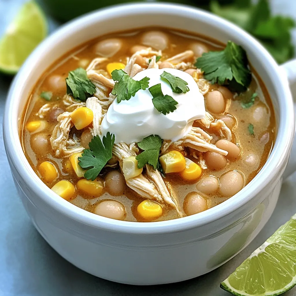 To make Slow Cooker White Chicken Chili, you need a few simple ingredients. Each one adds a special touch to the dish. Here is the list of ingredients: - 2 boneless, skinless chicken breasts - 1 can (15 oz) white beans (cannellini or great northern), rinsed and drained - 1 can (4 oz) diced green chilies - 1 medium onion, finely diced - 2 cloves garlic, minced - 1 cup corn (fresh, frozen, or canned) - 4 cups low-sodium chicken broth - 1 teaspoon ground cumin - 1 teaspoon chili powder - 1/2 teaspoon smoked paprika - Salt and pepper to taste - 1 cup sour cream or Greek yogurt - 1 cup shredded Monterey Jack cheese - Fresh cilantro, chopped, for garnish - Lime wedges for serving Each ingredient plays a role. The chicken provides a juicy base. The white beans add creaminess and protein. Diced green chilies bring heat and flavor. Onion and garlic give a nice aroma. Corn adds sweetness and texture. Using low-sodium chicken broth keeps the dish healthy. Seasonings like cumin, chili powder, and smoked paprika create depth. Sour cream or Greek yogurt makes it creamy. Finally, fresh cilantro and lime add brightness. I love how this chili is both simple and satisfying. You can easily find all these ingredients at the store. Feel free to swap some based on what you prefer or have at home. Enjoy cooking! 1. Layering the Chicken at the Bottom Start by placing the two boneless, skinless chicken breasts at the bottom of your slow cooker. This forms the base of your chili and helps keep the meat tender. 2. Adding Beans, Chilies, and Vegetables Next, add the rinsed white beans, the can of diced green chilies, and the finely diced onion. Don't forget the minced garlic and corn! Layer these ingredients right on top of the chicken. This keeps the flavors rich and balanced. 3. Pouring in Broth and Seasoning Now, pour in the four cups of low-sodium chicken broth. This adds moisture and flavor. Season with one teaspoon of ground cumin, one teaspoon of chili powder, and half a teaspoon of smoked paprika. Add salt and pepper to taste. Give everything a gentle stir to mix well. 1. Setting the Slow Cooker Secure the lid on the slow cooker. Set it to cook on low for 6 to 8 hours. You can also choose high for 3 to 4 hours if you’re short on time. 2. Cooking Time and Temperature Let the slow cooker do its magic. The chicken should be tender and fully cooked when time is up. You can check it by cutting into the chicken. It should be white all the way through. 1. Shredding the Chicken Once cooked, carefully take out the chicken breasts. Place them on a cutting board. Use two forks to shred them into bite-sized pieces. Return the shredded chicken to the pot. 2. Incorporating Dairy Now, mix in one cup of sour cream or Greek yogurt. Add one cup of shredded Monterey Jack cheese. Stir until the cheese melts and the chili becomes creamy. 3. Adjusting Seasoning for Taste Taste your chili. Add more salt, pepper, or spices if needed. This step helps you get the flavor just right. Let the chili cook for an extra 15 minutes. This lets all the flavors blend together. Ladle the hot chili into bowls and enjoy! - Adding Fresh Herbs and Spices: Fresh herbs like cilantro can elevate your chili. Their bright taste adds depth. You can mix them in at the end for a fresh burst. Spices like cumin and smoked paprika bring warmth. Adjust these to match your taste. - Options for Extra Creaminess: Sour cream or Greek yogurt makes this chili rich. You can blend it in for smoothness. For a twist, try adding cream cheese or a splash of heavy cream. This will enhance the texture, making it feel luxurious. - Recommended Slow Cooker Type: A 6-quart slow cooker works best for this recipe. It gives enough space for all your ingredients. Look for one with a non-stick insert for easy cleanup. - Essential Cooking Tools for Preparation: A good knife and cutting board are key for prepping. Use measuring cups and spoons for accuracy. A can opener is a must for beans and chilies. Keep a pair of tongs handy for shredding chicken too. - Bowl Presentation Ideas: Serve your chili in warm bowls for comfort. Garnish with chopped cilantro and a lime wedge. This adds color and freshness. For crunch, offer crispy tortilla chips on the side. - Best Sides to Serve with Chili: Cornbread is a classic side. It pairs well with the chili's creaminess. A simple salad can balance the meal too. Try a light green salad with a citrus dressing. {{image_4}} You can change the meat if you want. Instead of chicken, use turkey. This keeps the dish leaner. For a vegetarian option, try using hearty mushrooms or lentils. They add great texture and flavor. You can also switch the beans. Use black beans or pinto beans if you prefer. Both add a nice taste and color to your chili. You can make the chili as mild or spicy as you like. For a milder taste, skip the green chilies or use fewer spices. Adding more sour cream can help reduce heat too. To spice it up, add jalapeños or more chili powder. If you want more depth, try adding cayenne pepper. Just a pinch can go a long way. If you're looking for gluten-free tips, this recipe is already safe. All the ingredients are gluten-free, so enjoy without worry. For low-fat alternatives, choose skinless chicken thighs instead of breasts. You can also use low-fat yogurt instead of sour cream. These swaps keep flavor while cutting fat. To store leftover chili, let it cool first. Use an airtight container for storage. Place the chili in the fridge within two hours of cooking. It will stay fresh for three to four days. Always label the container with the date. This helps you keep track of how long it’s been stored. If you have more chili than you can eat, freezing is a great option. Allow the chili to cool completely before freezing. Use freezer-safe containers or bags. Leave some space for the chili to expand. It can last up to three months in the freezer. When ready to eat, thaw it overnight in the fridge. You can reheat chili on the stovetop or in t