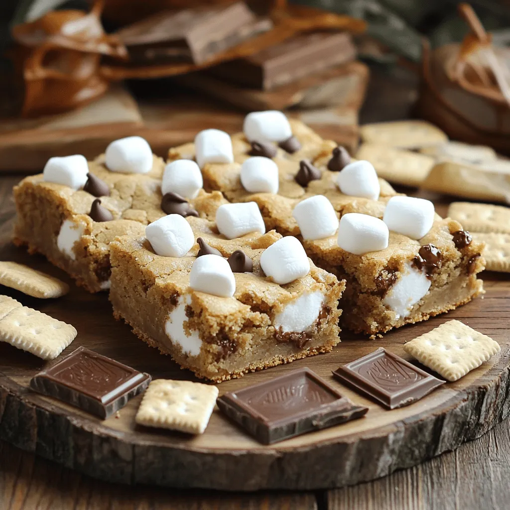 To make S’mores Cookie Bars, you'll need some simple yet delicious ingredients. Each one adds to the flavor and fun of this treat. Here's what you need: - 1 cup unsalted butter - 1 cup packed brown sugar - ½ cup granulated sugar - 2 large eggs - 1 teaspoon pure vanilla extract - 2 ½ cups all-purpose flour - 1 teaspoon baking soda - ½ teaspoon fine sea salt - 1 cup semi-sweet chocolate chips - 1 cup mini marshmallows - 1 cup graham cracker crumbs - Optional toppings: Extra marshmallows, chocolate chips These ingredients combine to create a chewy, gooey delight. The butter makes it rich, while the sugars add sweetness. Eggs give the bars nice structure. The flour and baking soda help them rise. Chocolate chips and marshmallows make every bite a tasty surprise. Graham cracker crumbs bring that classic s’mores flavor. You can even add more marshmallows or chocolate chips on top for extra fun! For the full recipe, check out the details on how to bring this treat to life. Start by preheating your oven to 350°F (175°C). Grease a 9x13 inch baking pan or line it with parchment paper. This makes it easy to remove the bars later. In a large bowl, mix the softened butter, brown sugar, and granulated sugar. Use a hand mixer or stand mixer. Blend until light and fluffy, about 2-3 minutes. Next, add the eggs one at a time. Mix well after each egg. Finally, stir in the vanilla extract for extra flavor. In another bowl, whisk together the flour, baking soda, and salt. Gradually add this dry mix to the wet mix. Stir gently until combined. Be careful not to overmix, as this can affect the texture. Now, it's time to create the delicious dough! Carefully fold in the chocolate chips and graham cracker crumbs. Use a spatula to ensure they are evenly spread in the dough. This adds a great texture and flavor to each bite. Set aside a small amount of mini marshmallows and chocolate chips for later. Next, transfer the dough to your prepared baking pan. Press it down firmly into an even layer. Now, sprinkle the reserved mini marshmallows and chocolate chips on top. Press them gently into the dough. This helps them stick as they bake. Place the baking pan in your preheated oven. Bake for 25-30 minutes. You want the edges to turn golden brown. The center should look set, and a toothpick should come out with a few moist crumbs. Once baked, remove the pan from the oven. Let the cookie bars cool for at least 10 minutes in the pan. After cooling, lift the bars out using the parchment paper. Slice them into squares or rectangles. For a special touch, use a kitchen torch to lightly toast the tops before serving. This gives them a nice, toasted flavor. You can find the full recipe for these delightful bars above. Enjoy every bit of this sweet treat! To make the best S’mores cookie bars, avoid overmixing your dough. When you mix too much, the bars can turn out dense. Mix just until you see no flour. This keeps your bars light and chewy. Layering toppings helps create great texture. Start with a base of chocolate chips, then add graham cracker crumbs and mini marshmallows on top. This gives you a nice crunch as you bite into the soft cookie. For a fun serving idea, cut the cookie bars into fun shapes with cookie cutters. You can also stack them on a plate with extra chocolate squares beside them. This makes a great treat for parties or family gatherings! Garnish the top with a light dusting of graham cracker crumbs. This makes your bars look more like real S’mores. You can also toast some extra mini marshmallows on top for a campfire vibe. Make sure to measure your ingredients accurately. Using too much flour or sugar can change the texture of your cookie bars. Use a kitchen scale for the best results. Recognizing doneness is key. Your bars should be golden brown at the edges. The center might look a bit soft, but it will firm up as it cools. A toothpick should come out with a few moist crumbs, not wet batter. {{image_4}} You can make S'mores Cookie Bars gluten-free. Use gluten-free flour blends. Look for ones that have a good mix of starches. These blends often mimic regular flour well. You might need to add a bit more liquid. This keeps your bars chewy and moist. Want to change the taste? You can add peanut butter or butterscotch chips to the dough. These flavors blend well with chocolate. You can also toss in some assorted nuts. Walnuts or pecans add a nice crunch. Mix and match to find your favorite combo! Try some fun seasonal swaps! In fall, add pumpkin spice for a warm flavor. You can use it in the dough or sprinkle on top. In summer, fresh fruit can brighten your bars. Think strawberries or blueberries for a fresh twist. These small changes can make your treats feel new and exciting. To keep your s’mores cookie bars fresh, use airtight containers. This helps lock in moisture and flavor. Store the bars at room temperature. A cool, dry place is best for keeping them tasty. You can freeze cookie bars for later. First, let them cool completely. Then, wrap them tightly in plastic wrap and place them in a freezer bag. When you want to enjoy them, thaw at room temperature. For the best taste and texture, warm them in the oven for a few minutes. This brings back their soft, chewy goodness. S’mores cookie bars are best eaten within a week. After that, they may lose their charm. Look for signs of spoilage, like a dry texture or off smell. If they feel hard or crumbly, it’s time to toss them. Enjoy these delightful treats while they’re fresh! For the full recipe, check out the earlier section. You can check if the bars are ready by looking for a few key signs. First, the edges should turn a nice golden brown. The center must look set, not jiggly. You can also use a toothpick; if it comes out with a few moist crumbs, they are done. Yes, you can make these cookie bars ahead of time. Simply prepare the dough and store it in the fridge for up to 24 hours. When you are ready, bake them as usual. You can also bake