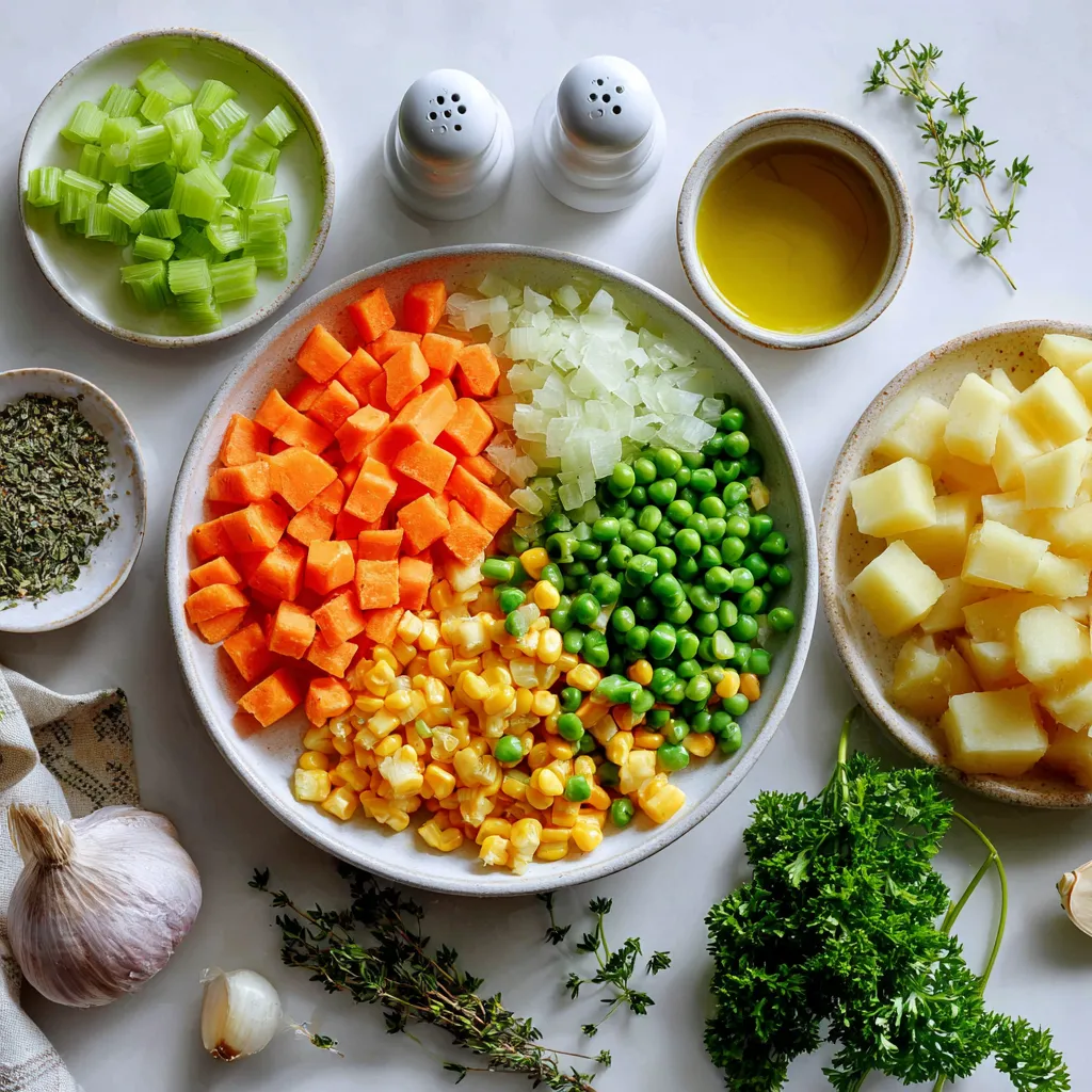 Next, dice a medium potato into small cubes. This potato adds heartiness to the soup. Don’t forget the frozen mixed vegetables. They save time and add color. Choose a mix with peas, corn, and green beans for variety.