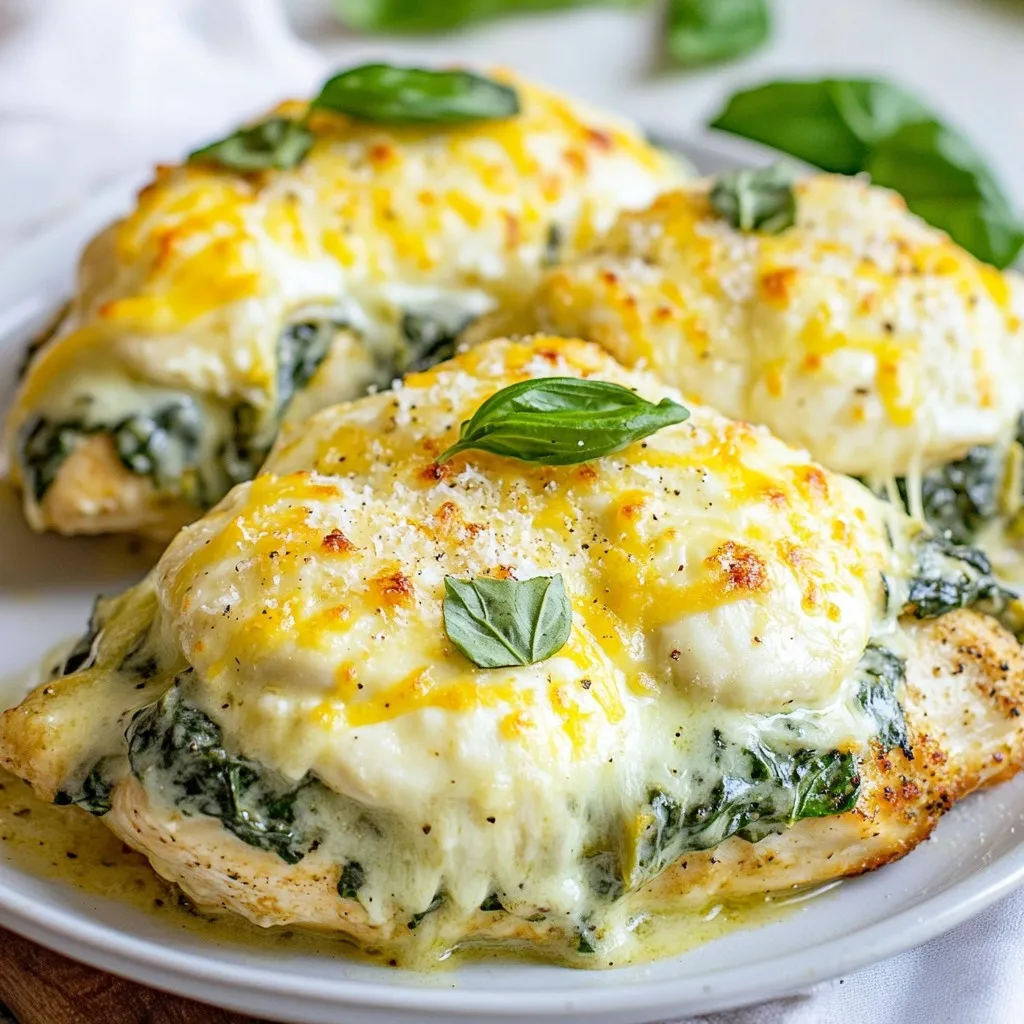 A creamy and cheesy chicken bake featuring spinach and artichokes, perfect for a comforting meal.