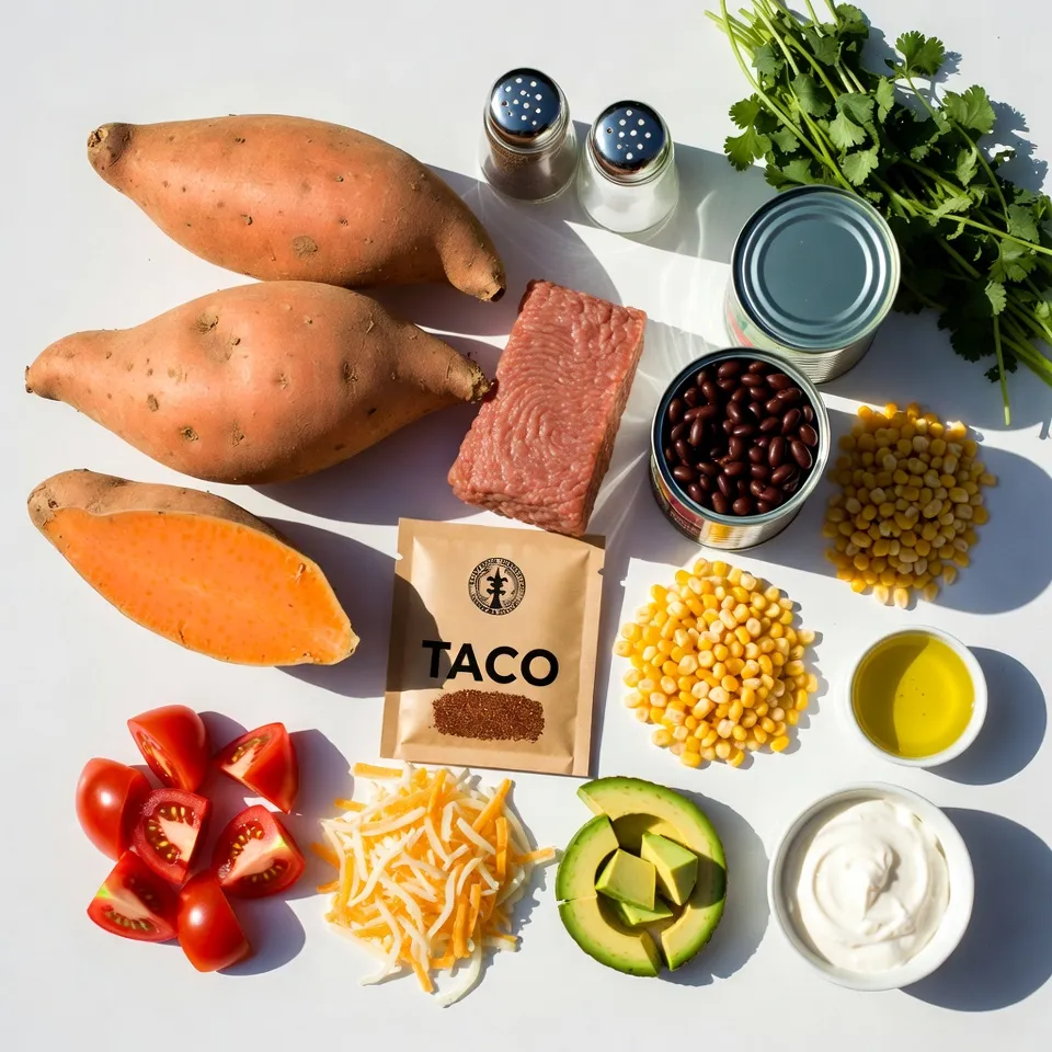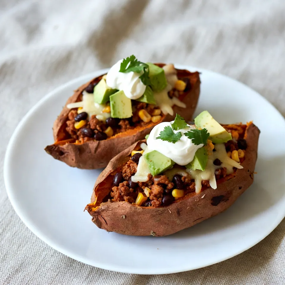 - 4 medium sweet potatoes - 1 lb ground turkey or chicken - 1 can black beans, drained and rinsed - 1 cup corn kernels (fresh or frozen) - 1 packet taco seasoning (about 2 tablespoons) - 1 cup diced tomatoes (canned or fresh) - 1 cup shredded cheese (cheddar or Mexican blend) - 1 ripe avocado, diced - ½ cup sour cream or Greek yogurt - Fresh cilantro, chopped (for garnish) - Salt and pepper to taste - Olive oil If you want to switch things up, here are some ideas: - Use ground beef or pork instead of turkey or chicken. - Swap black beans for pinto beans or kidney beans. - Try quinoa for a grain option instead of beans. - Use spicy cheese or add jalapeños for heat. - Greek yogurt can replace sour cream for a healthier twist. - If you want to skip dairy, use vegan cheese or avocado crema. These taco stuffed sweet potatoes are not just tasty; they are also packed with nutrition: - Calories: About 400 per serving - Protein: Approximately 30 grams - Carbohydrates: Roughly 45 grams - Fiber: Around 10 grams - Fat: About 15 grams Sweet potatoes give you vitamins A and C, while beans add protein and fiber. This meal is filling and balanced, perfect for a hearty lunch or dinner. {{ingredient_image_2}} Start by preheating your oven to 400°F (200°C). Rinse the sweet potatoes well under cold water, scrubbing off any dirt. Pat them dry with a paper towel. Use a fork to poke several holes in each sweet potato. This lets steam escape while they bake. Rub the skins with olive oil and sprinkle some salt on top. Place the sweet potatoes on a baking sheet lined with parchment paper. Bake for 45 to 60 minutes, or until they are soft and easy to pierce with a fork. While the sweet potatoes are baking, heat a large skillet over medium heat. Add 1 pound of ground turkey or chicken. Cook it for about 5 to 7 minutes, breaking it apart as it cooks. Once the meat is fully cooked, stir in 1 can of black beans, drained and rinsed, along with 1 cup of corn kernels and 1 cup of diced tomatoes. Sprinkle in 1 packet of taco seasoning. Mix everything well. Let it simmer for 5 to 10 minutes, stirring often, until heated through. Don’t forget to add salt and pepper to taste! After the sweet potatoes finish baking, take them out and let them cool for a few minutes. Carefully slice each sweet potato lengthwise to create a pocket. Use a fork to fluff the flesh inside each sweet potato, seasoning it lightly with salt. Now, fill each pocket with the taco mixture, making sure to distribute it evenly. Top each stuffed sweet potato with shredded cheese. Return them to the oven for another 5 to 10 minutes. This will melt the cheese and make it bubbly. Finally, add diced avocado, a dollop of sour cream or Greek yogurt, and a sprinkle of fresh cilantro on top. Enjoy your flavorful taco stuffed sweet potatoes! To get the best sweet potatoes, start by preheating your oven to 400°F (200°C). Rinse and scrub your sweet potatoes well. Make sure to poke holes in them with a fork. This helps steam escape while they roast. Rub olive oil on the skins and sprinkle a little salt. Place them on a baking sheet lined with parchment paper. Roast for 45 to 60 minutes. You want them soft enough that a fork goes in easily. This step ensures they’re perfectly tender inside. Toppings can take your taco stuffed sweet potatoes to the next level. After filling each potato, sprinkle on some shredded cheese. It melts beautifully, adding rich flavor. Fresh avocado adds creaminess and a nice texture. A dollop of sour cream or Greek yogurt brings a tangy contrast. Don’t forget the chopped cilantro for a burst of freshness. You can also add sliced jalapeños for heat or diced onions for crunch. Mix and match toppings to fit your taste! You can make taco stuffed sweet potatoes vegetarian too! Swap ground turkey or chicken for lentils or quinoa. Both options provide protein and fiber. Use black beans and corn to keep that hearty feel. You can also add extra veggies like bell peppers or zucchini to the mix. They add color and nutrients. With these variations, everyone can enjoy a delicious meal, no matter their dietary needs. Pro Tips Choosing Sweet Potatoes: Opt for sweet potatoes that are firm and free of blemishes or soft spots to ensure the best flavor and texture. Cooking Ground Meat: For a more flavorful filling, consider adding minced garlic and onion to the skillet when cooking the ground turkey or chicken. Cheese Options: Experiment with different types of cheese like Monterey Jack or queso fresco for a unique twist on the classic taco flavor. Make It Ahead: Prepare the taco mixture in advance and store it in the refrigerator. Simply reheat it when you're ready to serve it with the sweet potatoes! {{image_4}} You can switch up the protein in this dish. Ground turkey or chicken works great, but you can use beef or even pork. If you want a plant-based option, try lentils or tempeh. These choices give you variety and flavor. Each protein adds its own twist to the taco stuffed sweet potatoes. You control the spice level! If you like it hot, add some diced jalapeños or a dash of hot sauce. For a milder taste, skip the spicy ingredients. You can also use a mild taco seasoning for less heat. Adjusting the spice makes this meal perfect for everyone, no matter their taste. Don’t be shy about adding more veggies! Chopped bell peppers, zucchini, or spinach all work well. You can mix them into the taco filling for added nutrition. This not only boosts the flavor but also makes the meal more colorful and fun. Each bite will be a tasty surprise! After you enjoy your taco stuffed sweet potatoes, store any leftovers in an airtight container. Keep them in the fridge for up to four days. Make sure to let them cool down before sealing them up. If you want to keep them longer, consider freezing them. They will last for about three months in the freezer. Just remember to label the container with the date. To reheat your taco stuffed sweet potatoes, you can use the