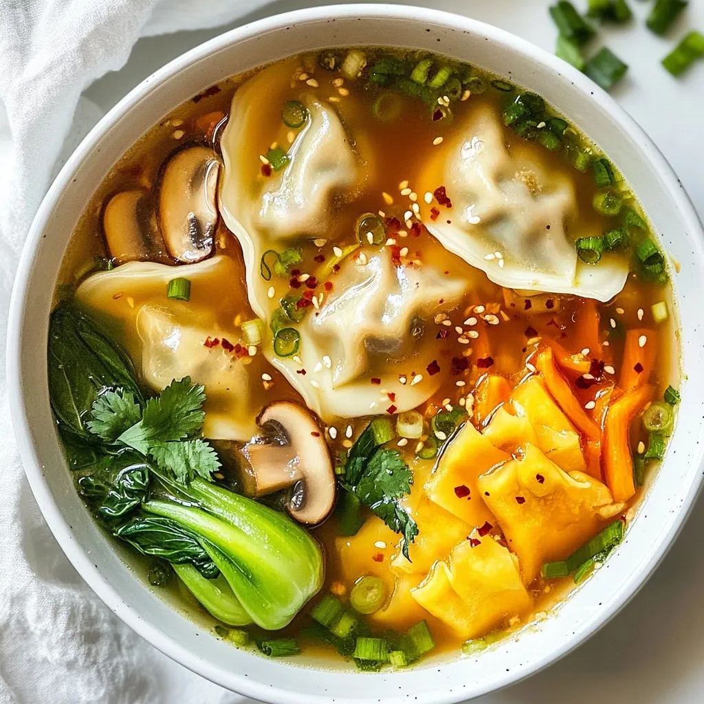 A flavorful soup featuring gyoza, vegetables, and a rich broth.